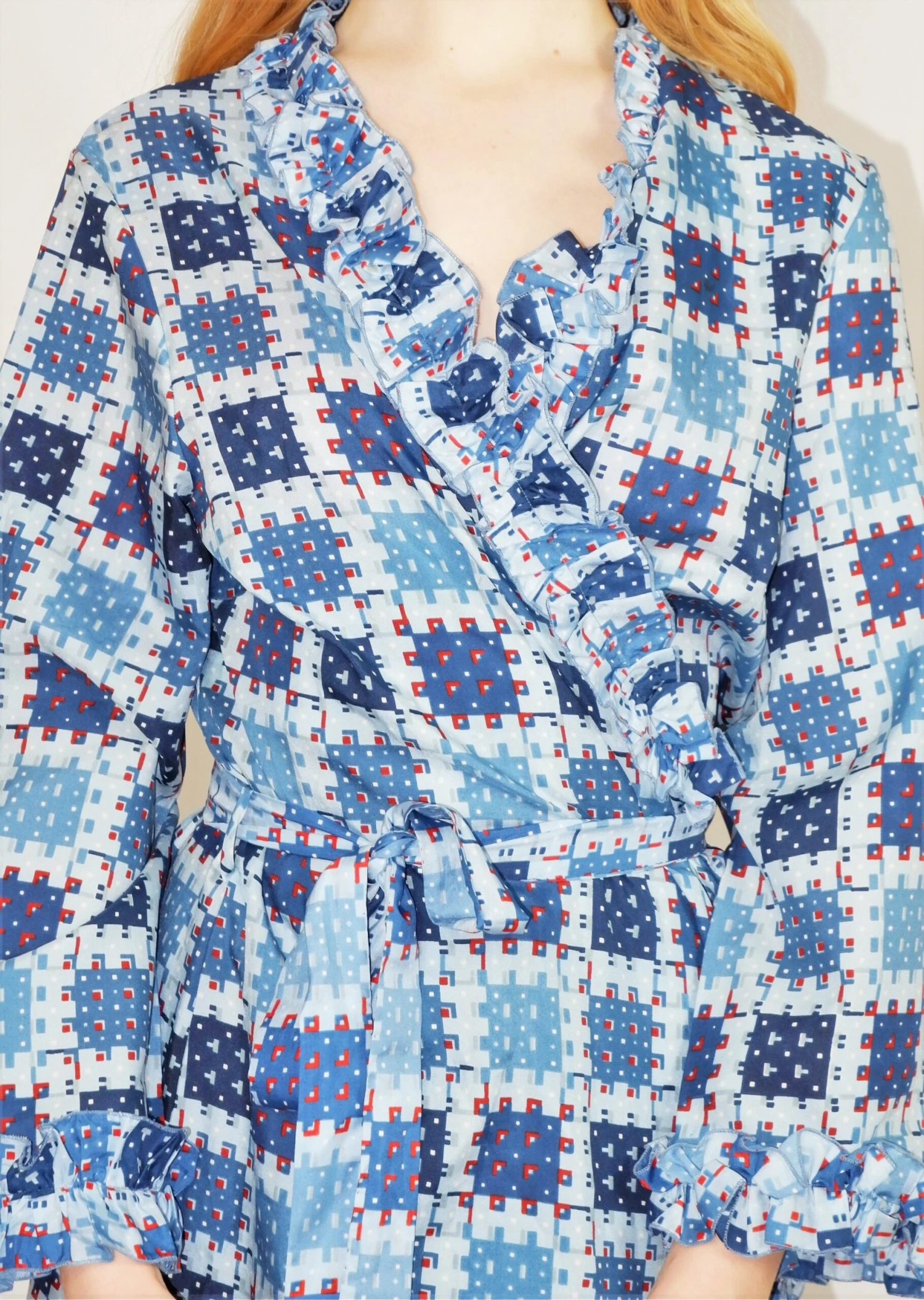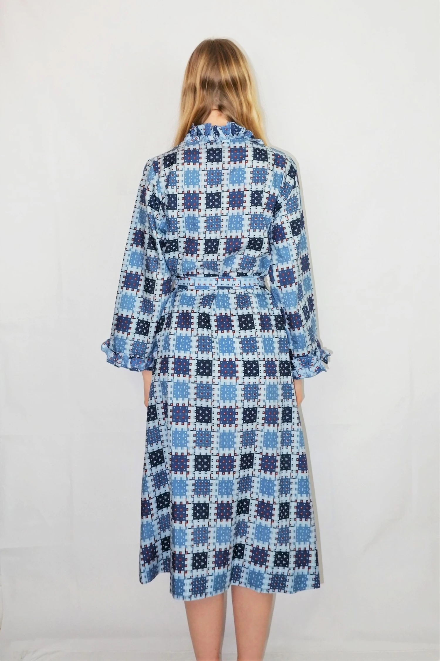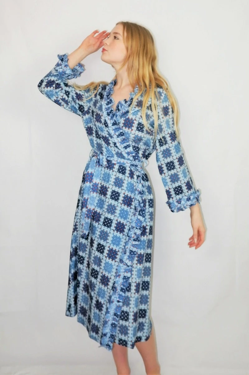 Lovely vintage 1970s housecoat or dress in a navy, sky blue and burnt orange weave print and has a gorgeous frill collar and comes with a belt!