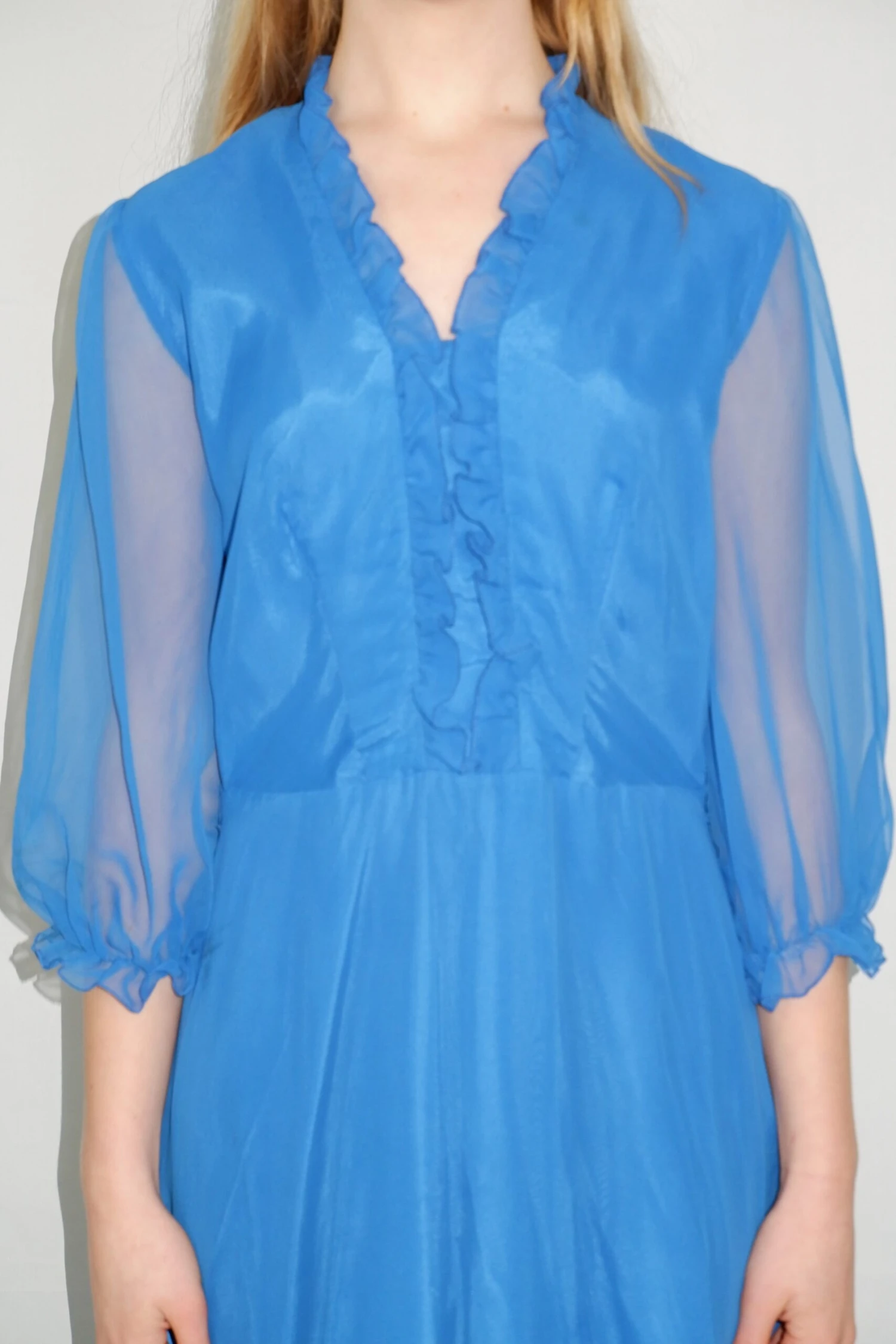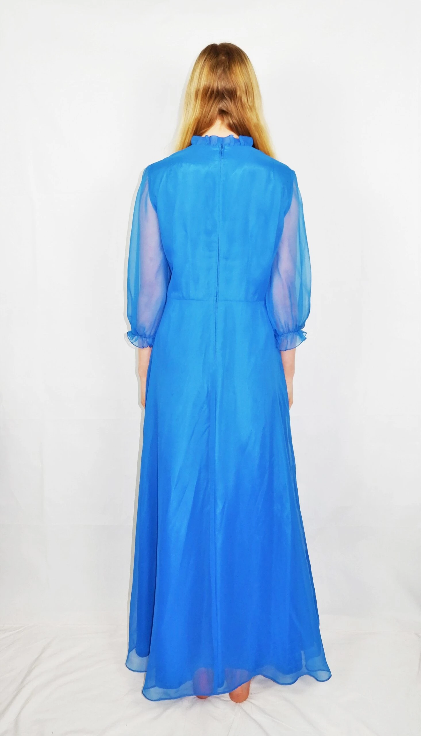 Stunning vibrant blue vintage maxi dress. With an elegant shape, frill neckline and sheer puffed sleeves. It would make a beautiful party gown with some boots! Also has a couple of belt loops.
