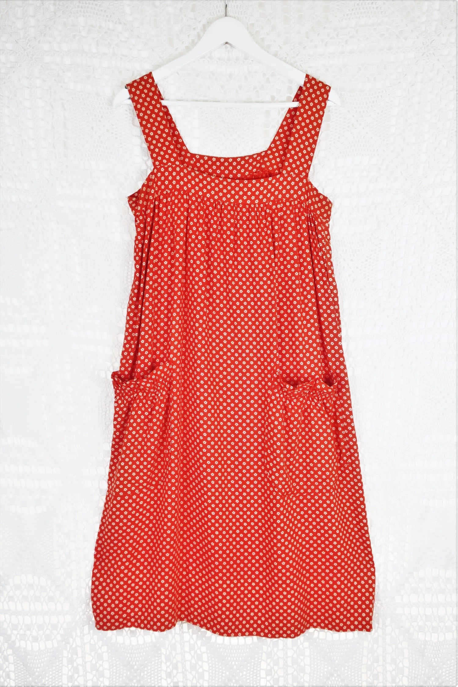 Absolutely adorable vintage 70’s floral pinafore dress in a red with white flowers. It has lovely ruched detail on the front pockets. Would look gorgeous with a white shirt or polar neck underneath for winter!