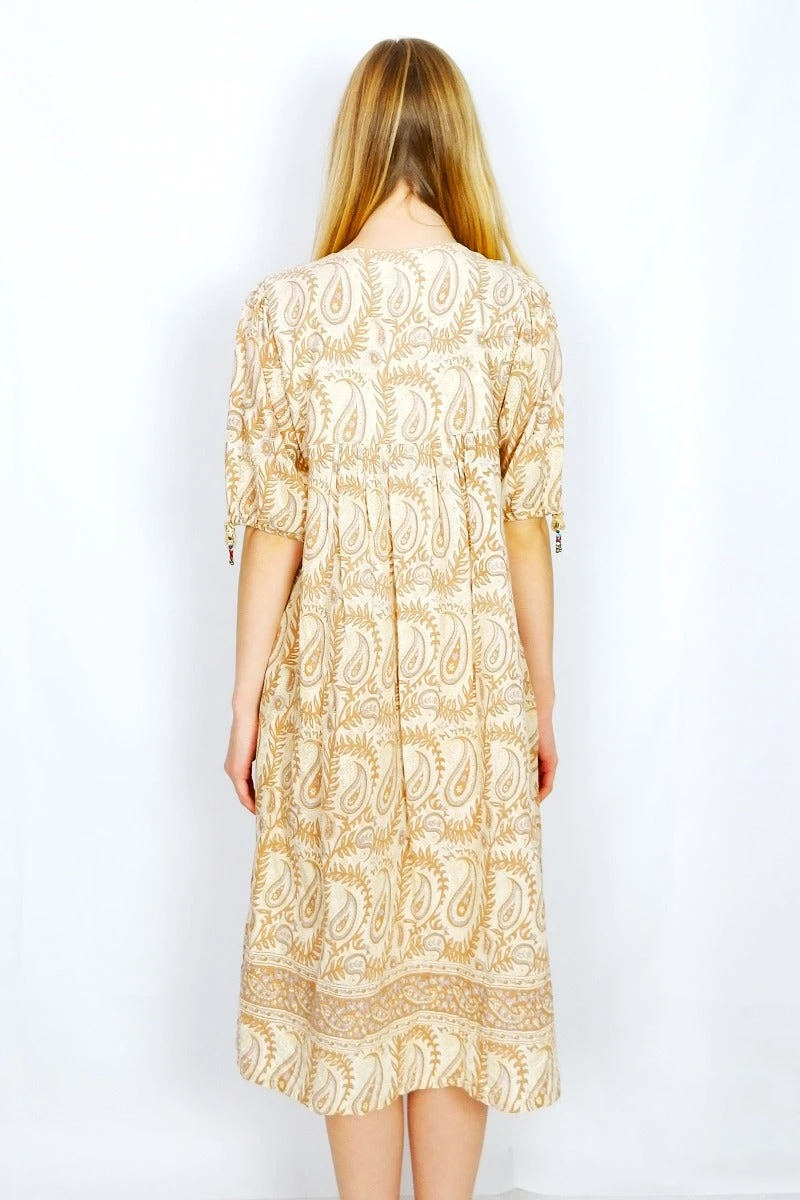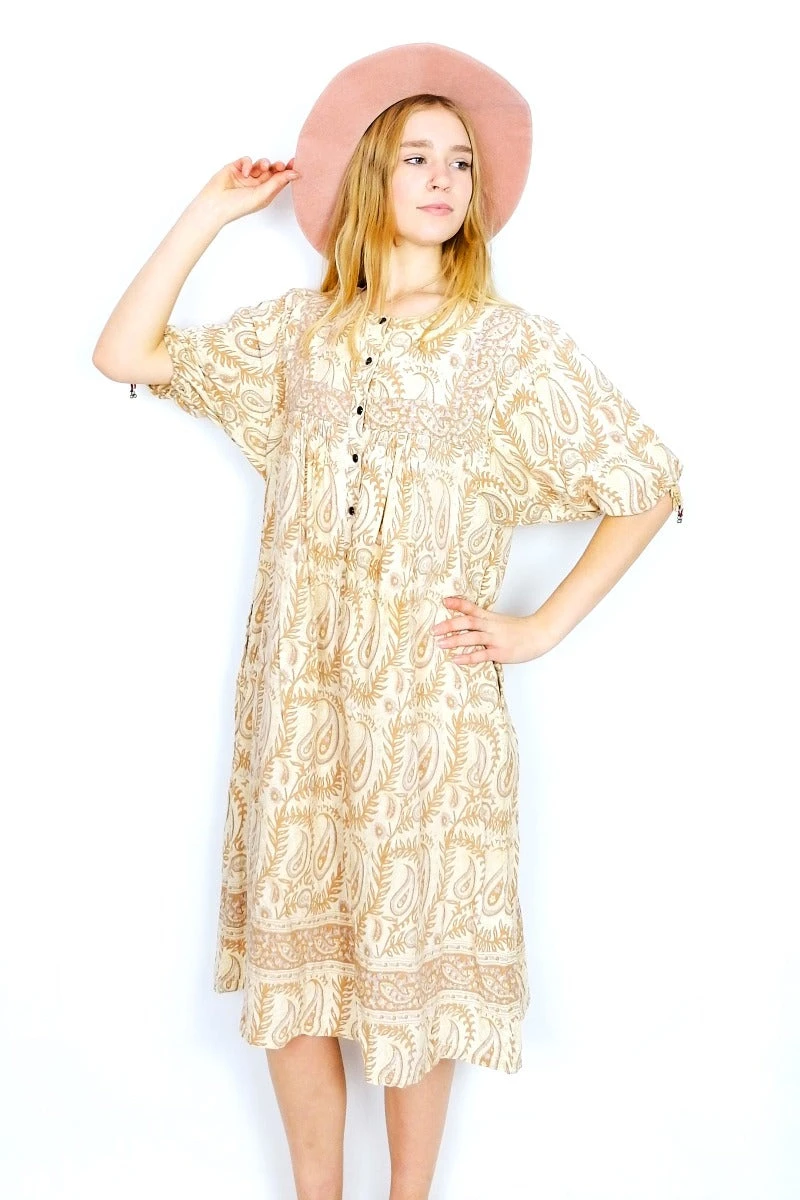 Gorgeous and super soft vintage 70s Indian cotton smock dress! With a classic print in an understated colour scheme, this midi length dress will be your best friend for spring & summer. Pair with boots, sunglasses and either a suede waistcoat or a vintage trench for an instantly iconic boho look.
