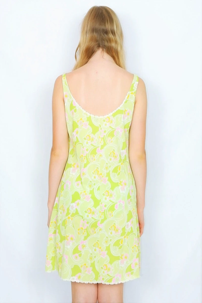 Very gorgeous vintage 70’s mini slip/nighty dress in a lovely pale lime colour with a cute pink and yellow ditsy floral print and lace trim.