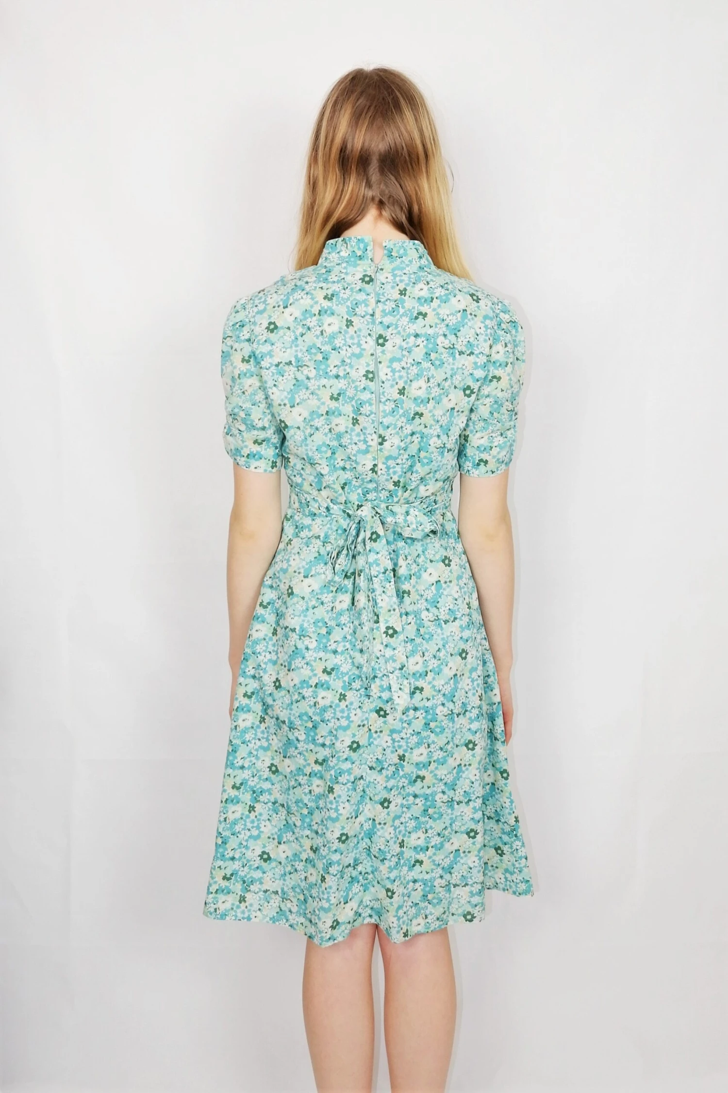 Very gorgeous vintage 70’s puff-sleeve tea dress with waist tie in lovely blue and white colours with a cute ditsy floral print. Would look gorgeous in summer with a hat and sandals!Â