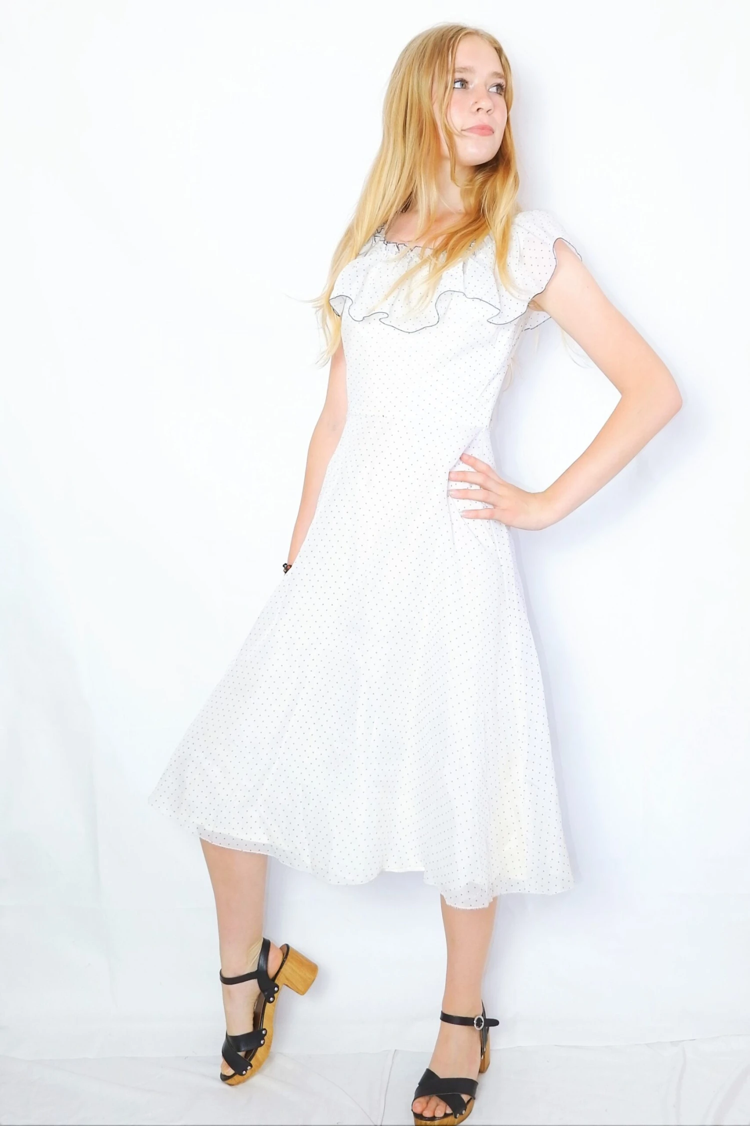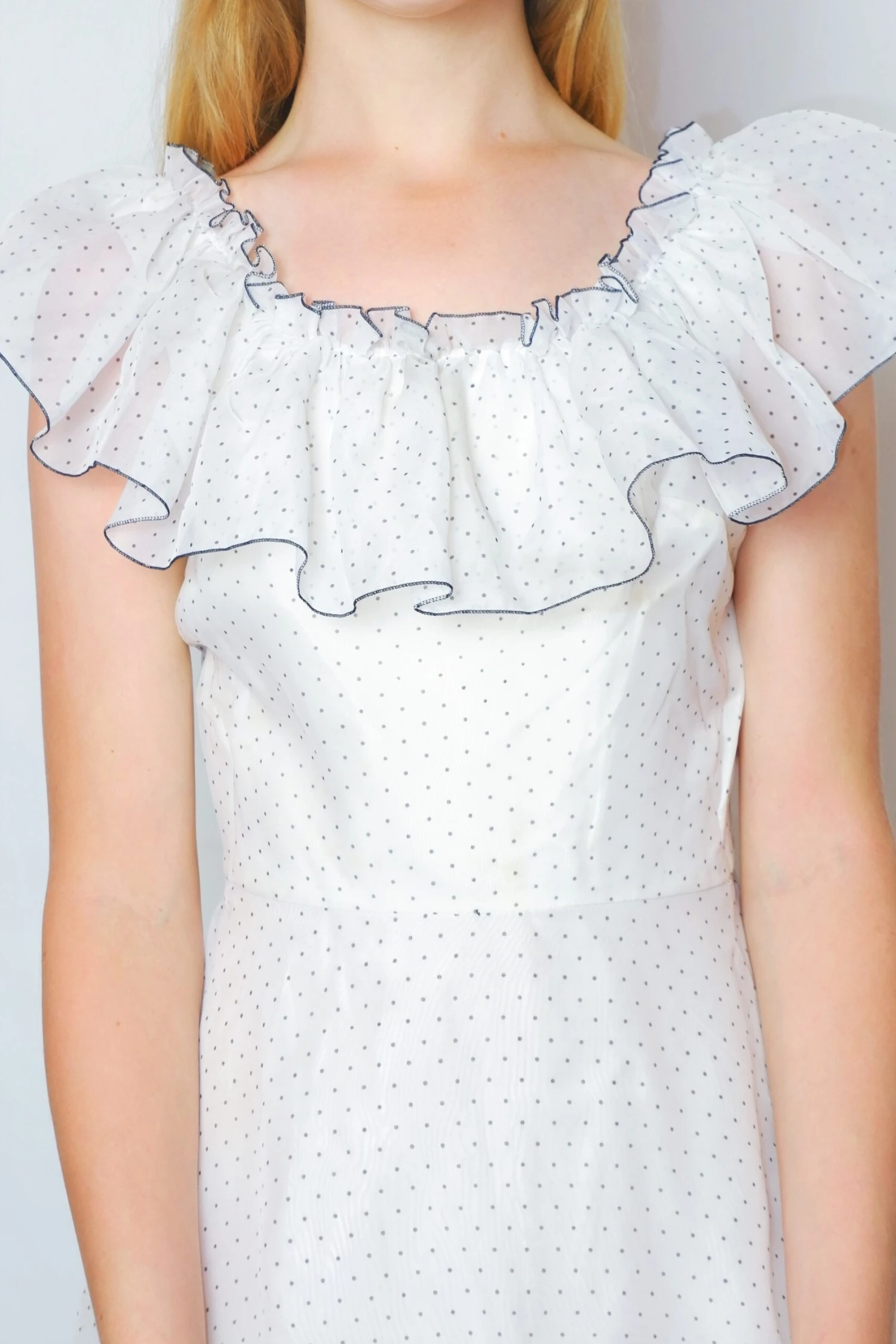 Sheer vintage sleeveless dress with a sweet polka dot pattern & frill embellishments