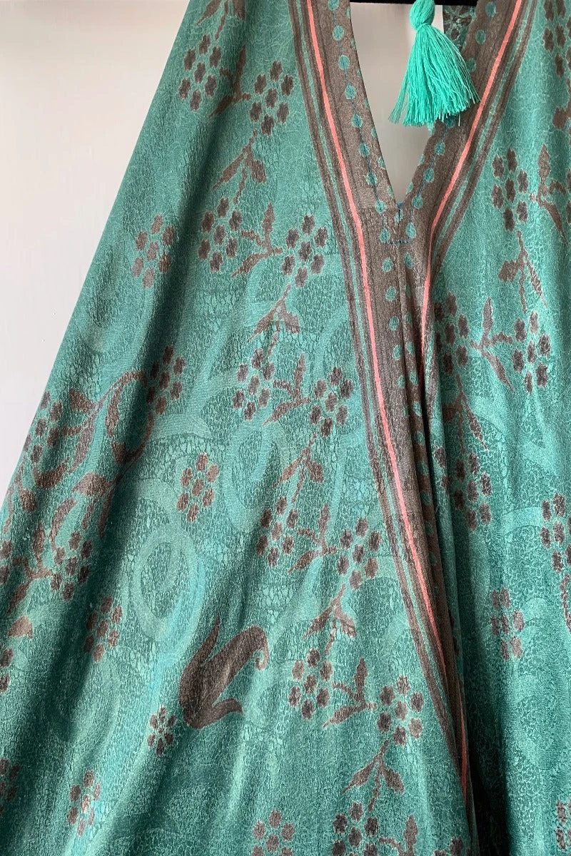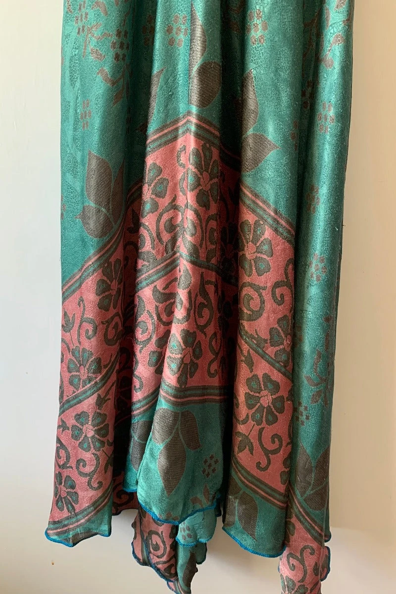 Vintage Indian Sari Fabric – Unknown Exact Content – Made from vintage recycled Indian fabrics. Feels like a silky viscose blend – Very lightweight and very sheer.