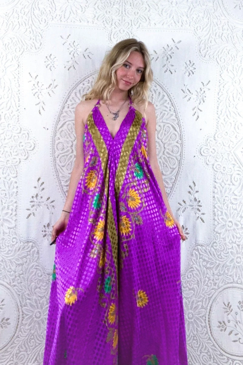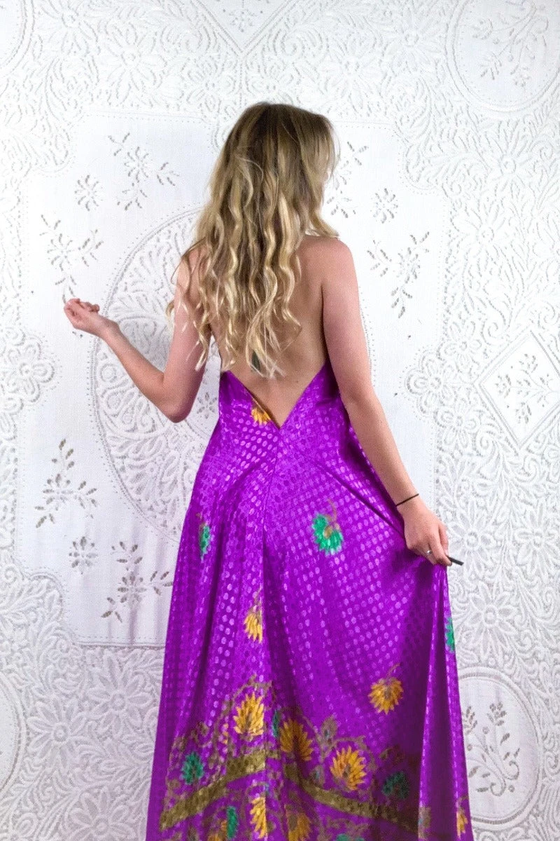 Vintage Indian Sari Fabric – Unknown Exact Content – Made from vintage recycled Indian fabrics. Feels like a silky soft blend – Very lightweight and slightly sheer. PLEASE NOTE the colour of this dress is a brighter, more pinky purple than the pictures suggest