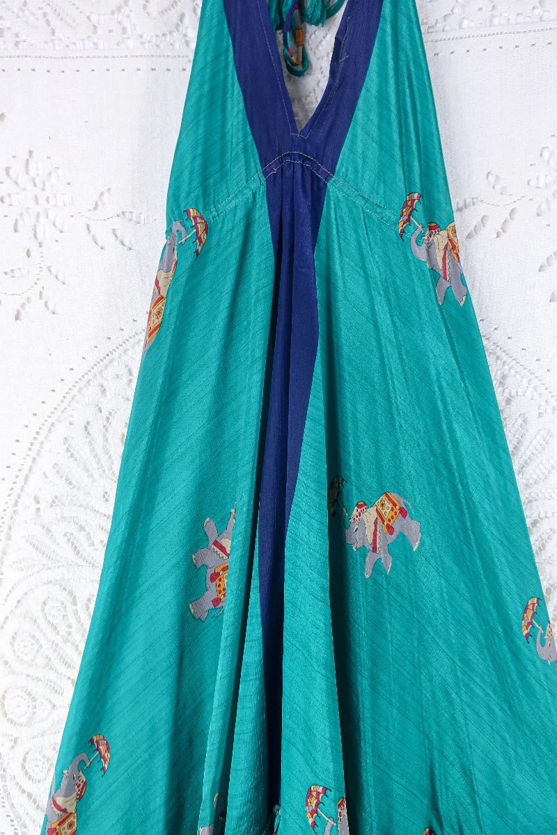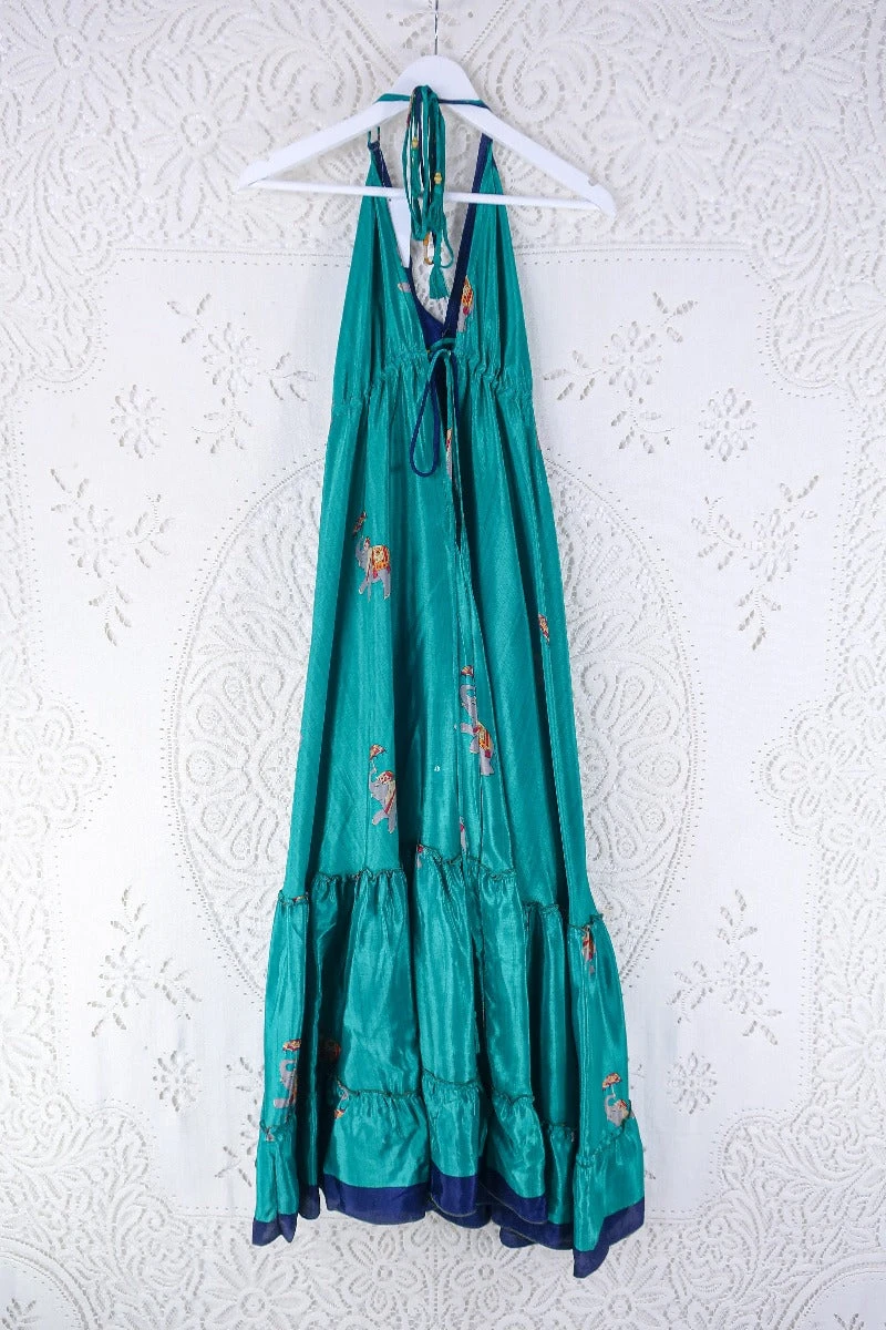 Blossom Halter Maxi Dress – Vintage Sari – Euphoric Elephant In Pine Green – Free Size L/XL