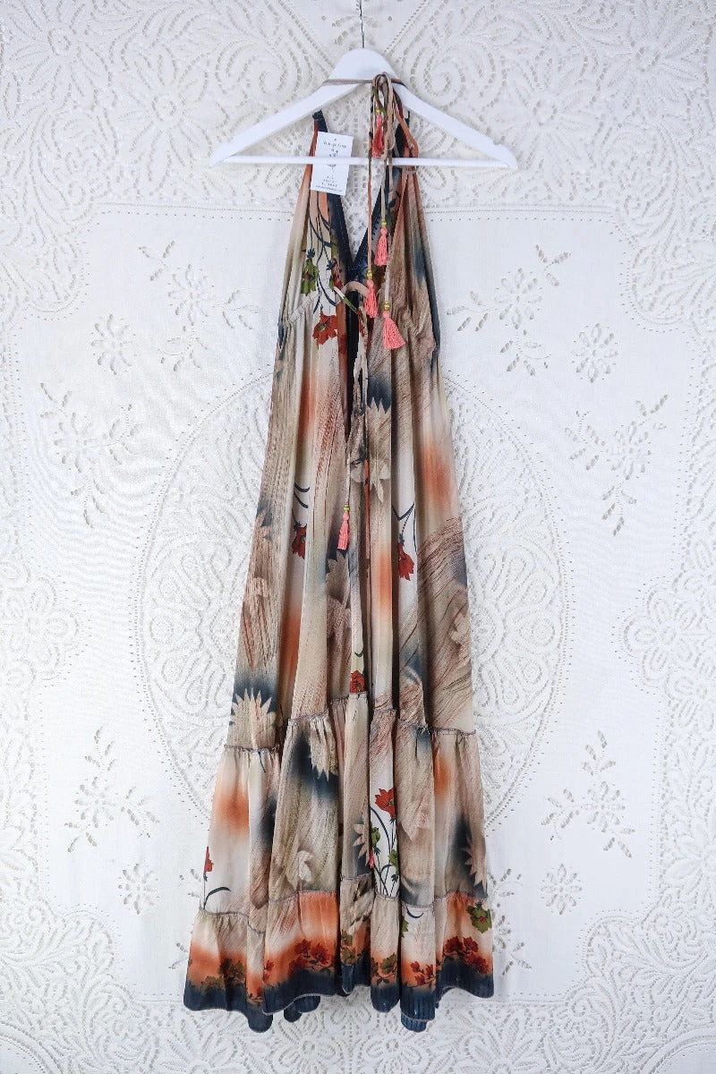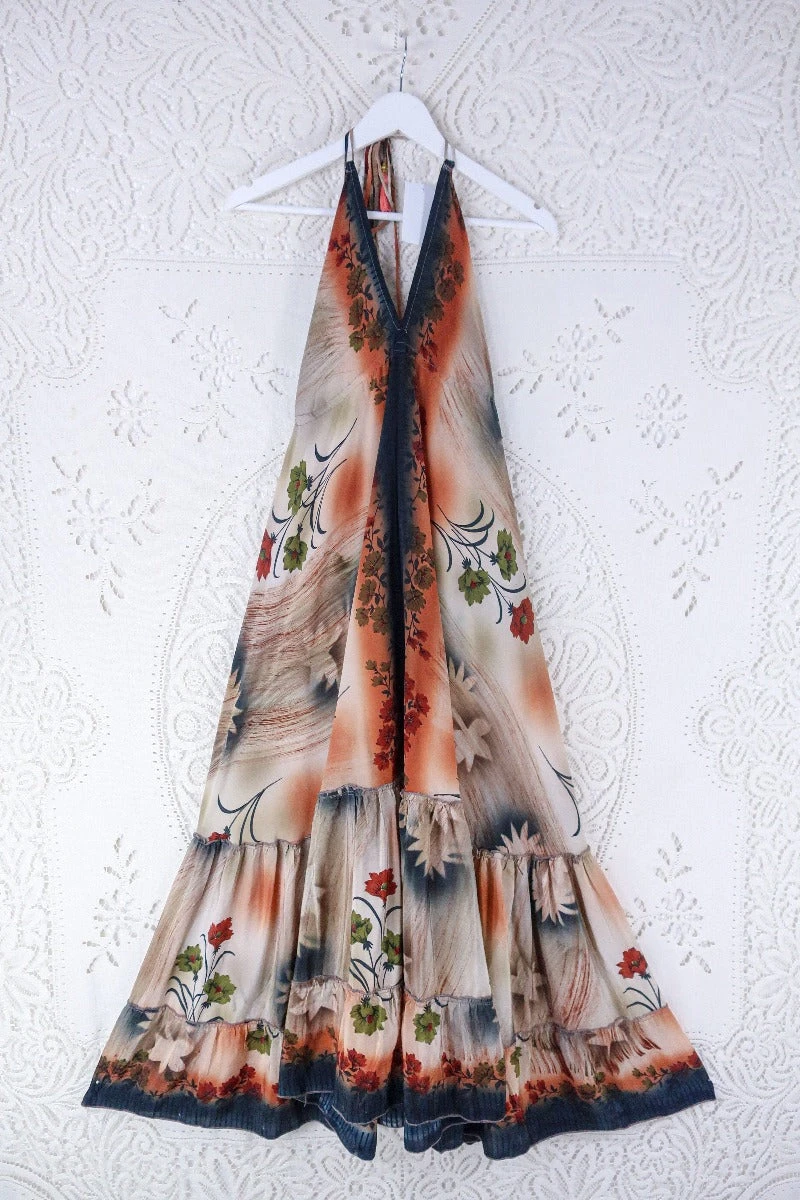 Stunning floaty halter-neck maxi dress with a tiered frill skirt.