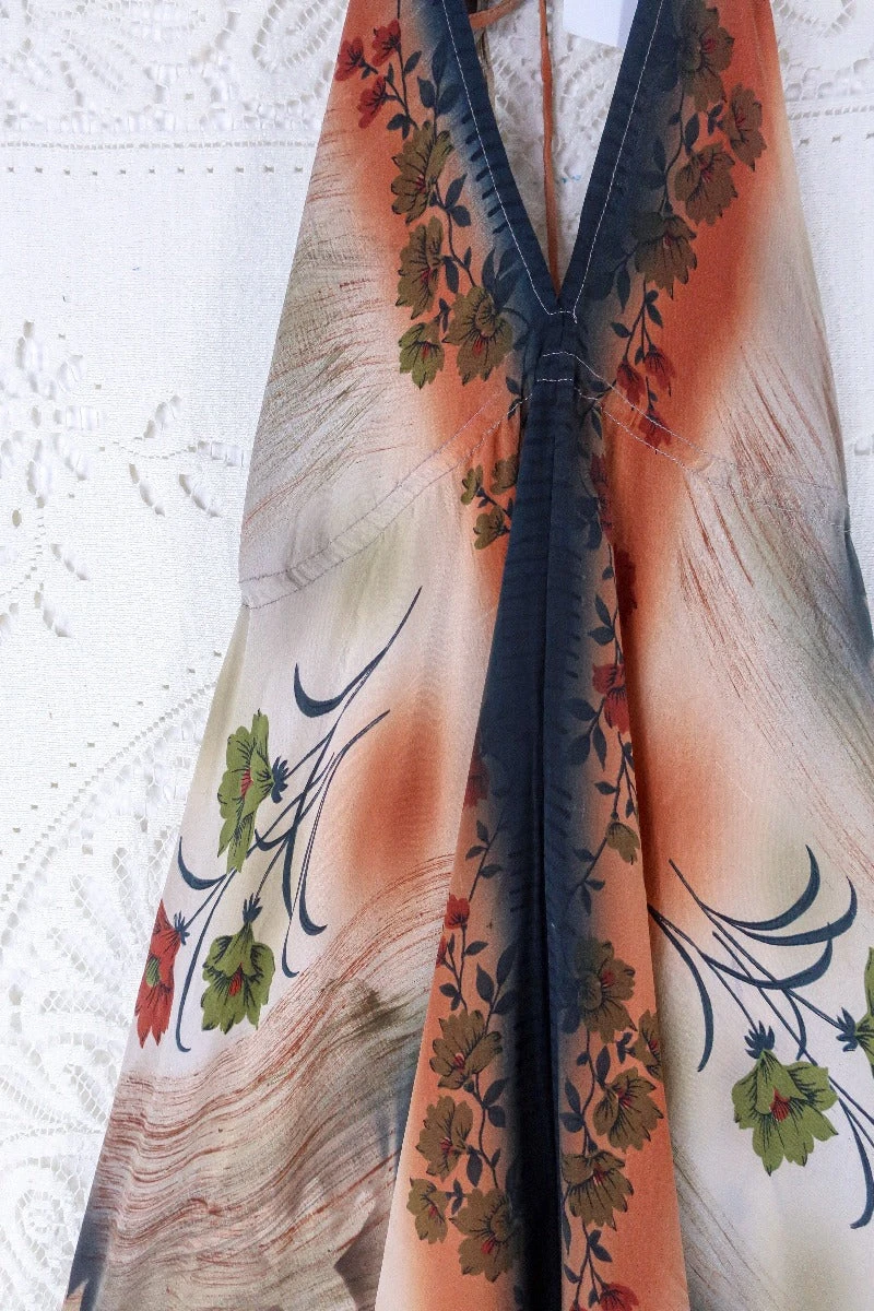 Made from vintage recycled Indian fabrics. Super soft silky material with a gorgeous colour and print. It has adjustable ribbon ties at the neck and waist to fit you perfectly.