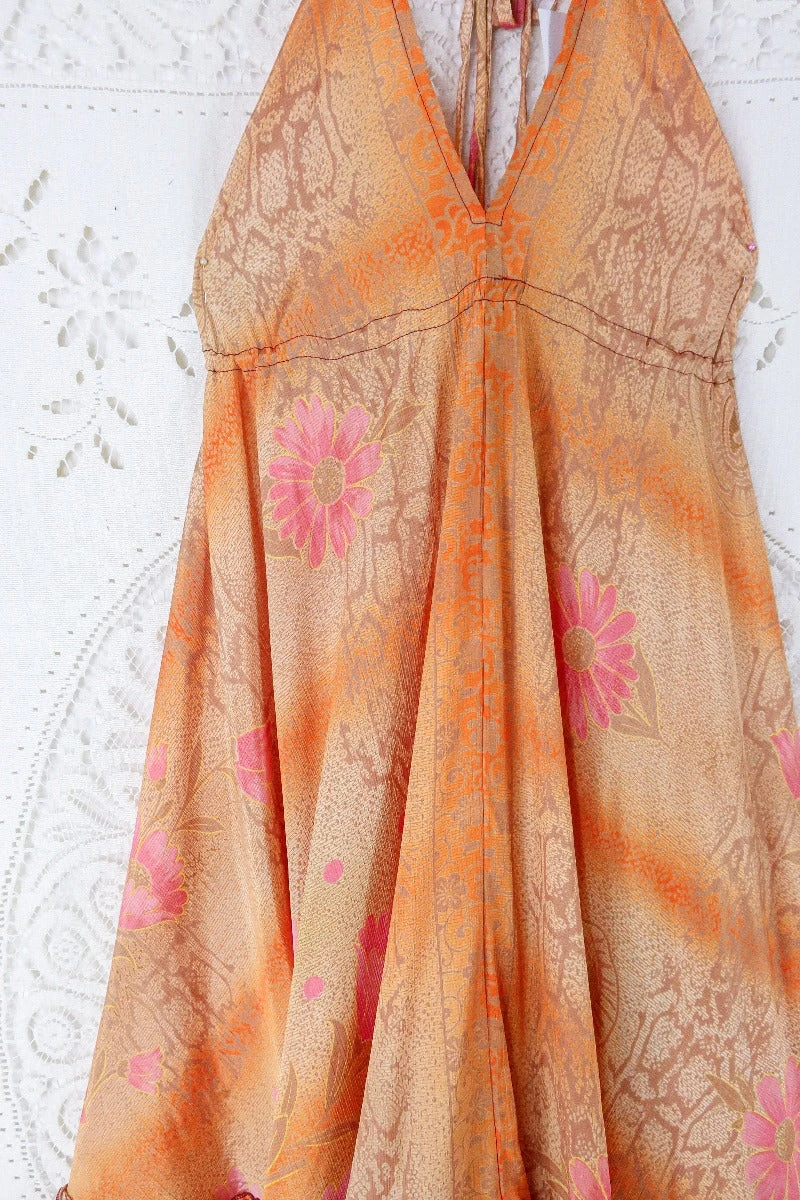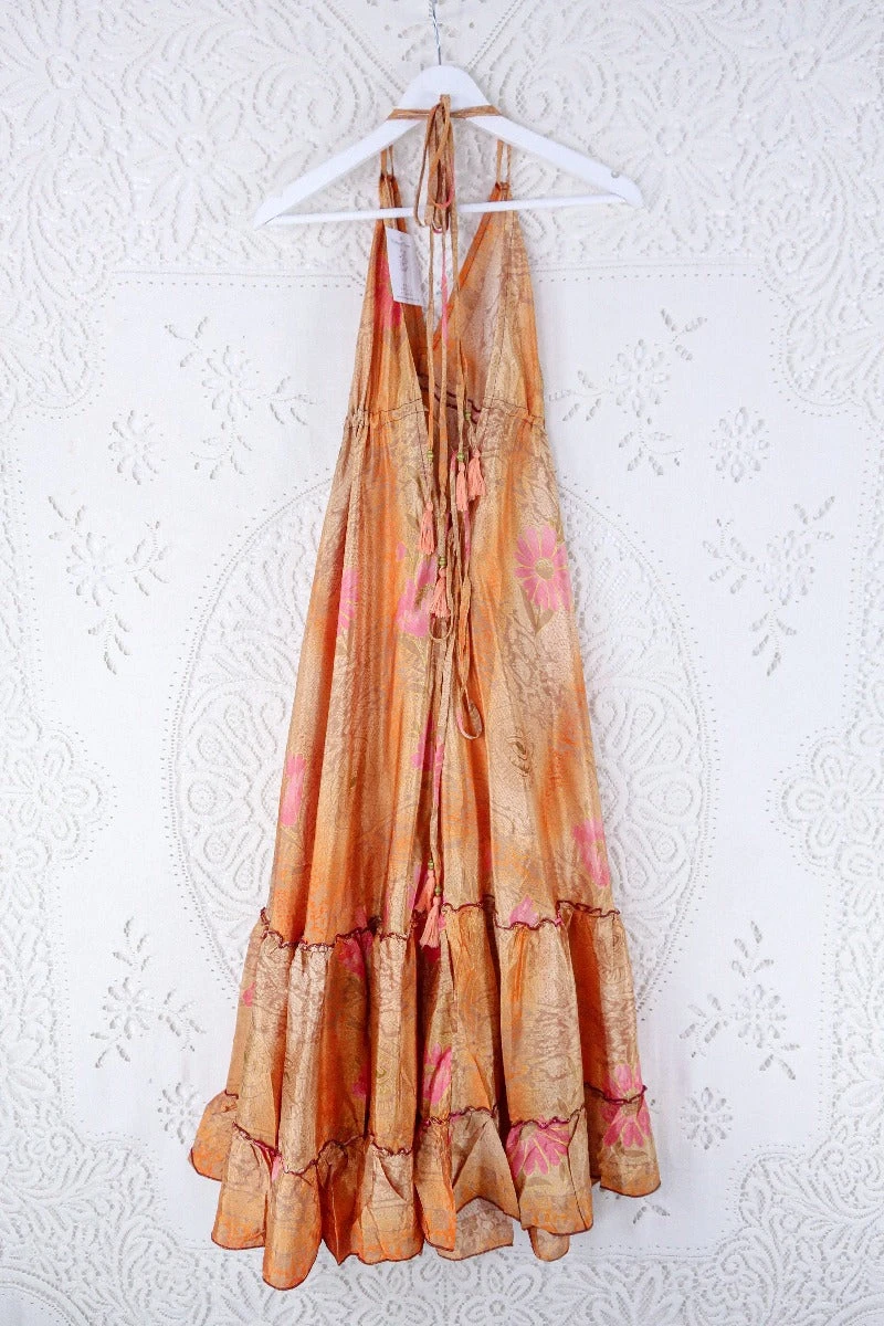 Made from vintage recycled Indian fabrics. Super soft silky material with a gorgeous colour and print. It has adjustable ribbon ties at the neck and waist to fit you perfectly.