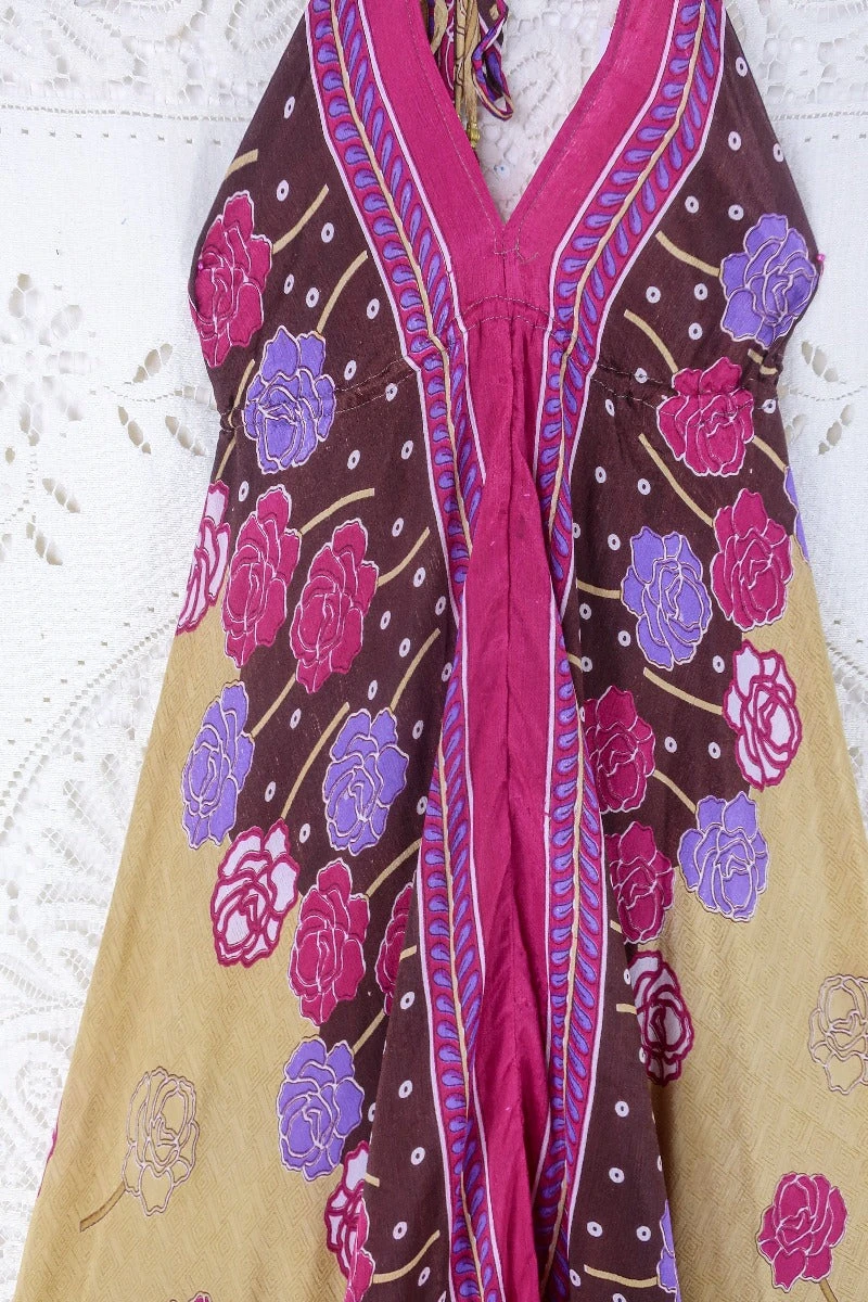 Made from vintage recycled Indian fabrics. Super soft silky material with a gorgeous colour and print. It has adjustable ribbon ties at the neck and waist to fit you perfectly.