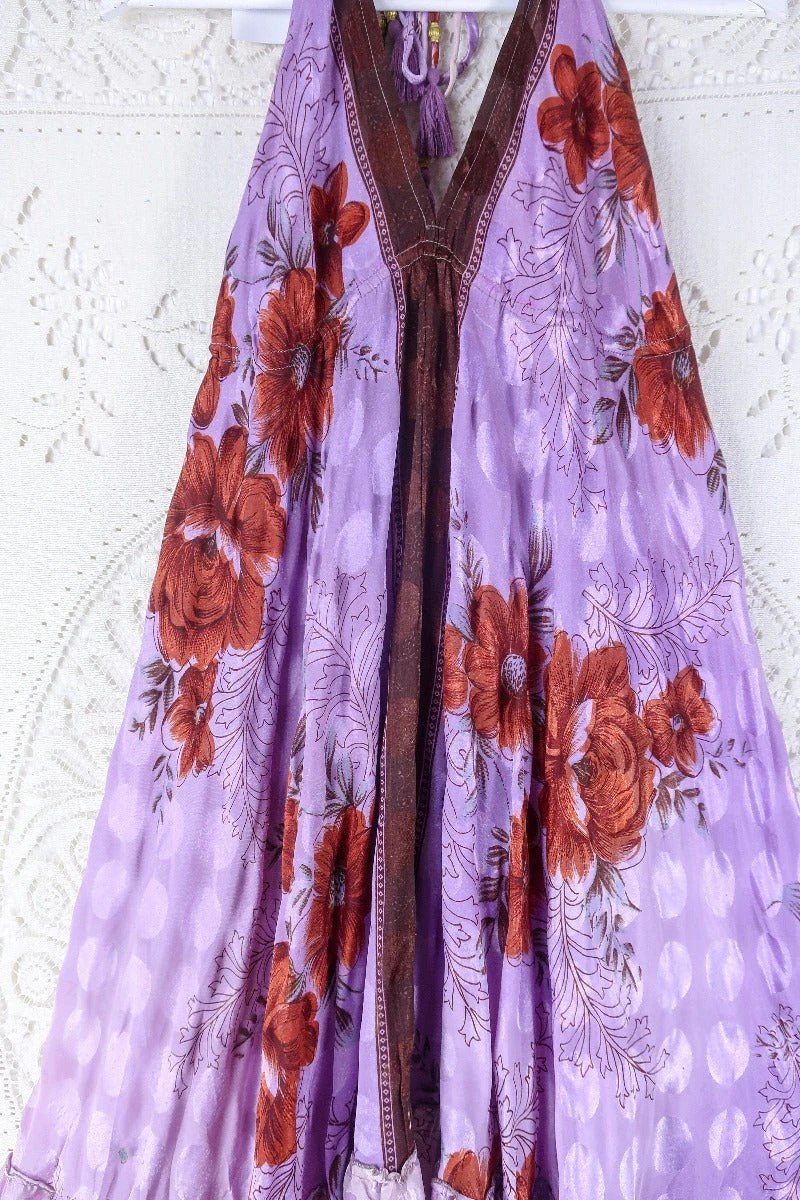 Made from vintage recycled Indian fabrics. Super soft silky material with a gorgeous colour and print. It has adjustable ribbon ties at the neck and waist to fit you perfectly.