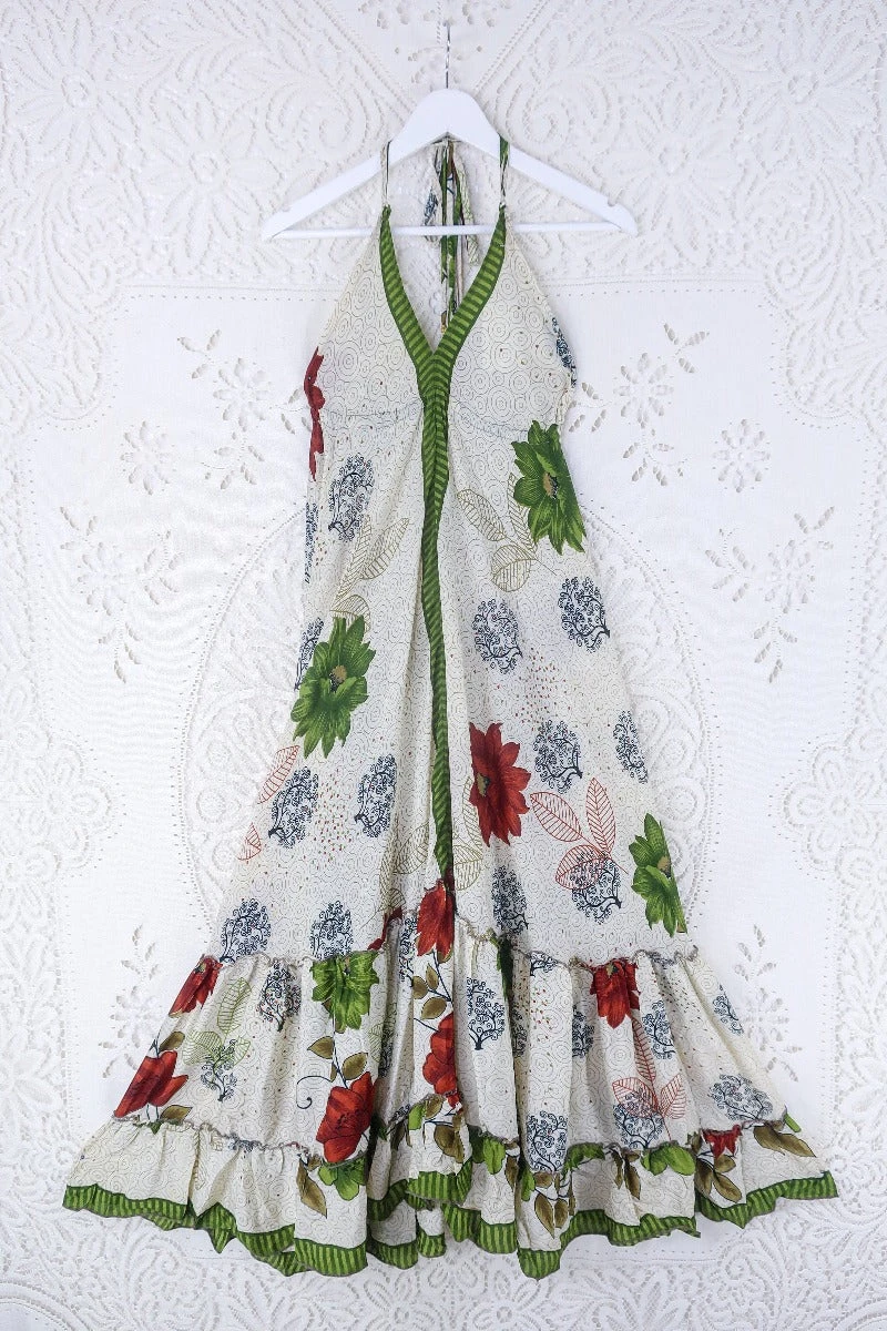 Stunning floaty halter-neck maxi dress with a tiered frill skirt.