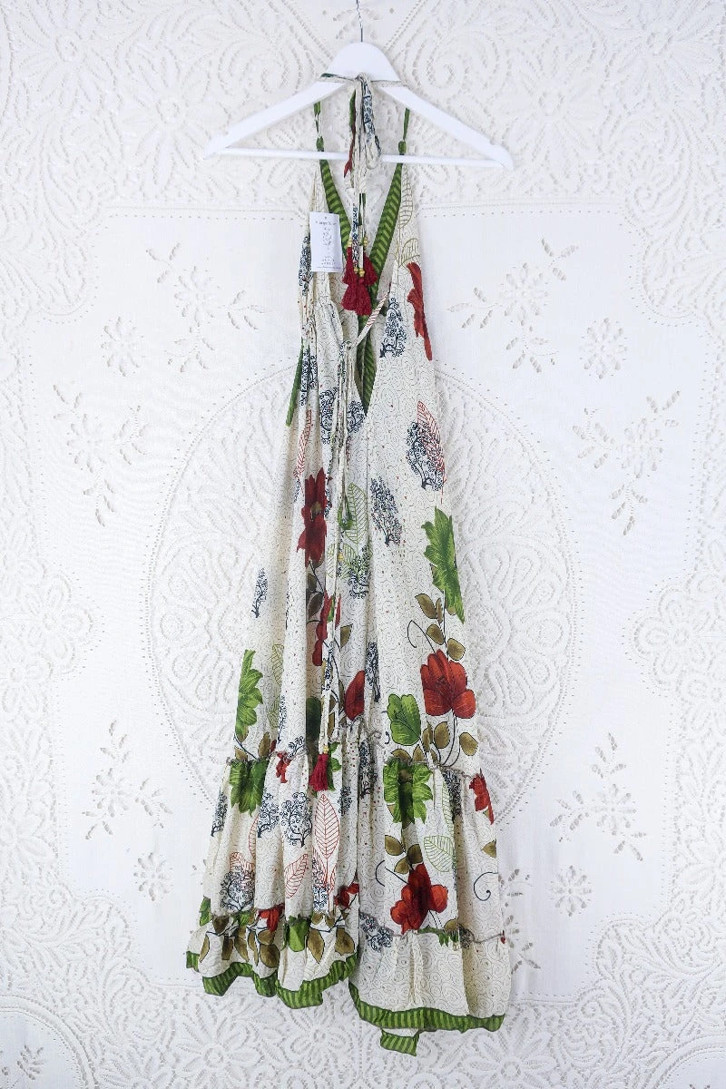 Made from vintage recycled Indian fabrics. Super soft silky material with a gorgeous colour and print. It has adjustable ribbon ties at the neck and waist to fit you perfectly.