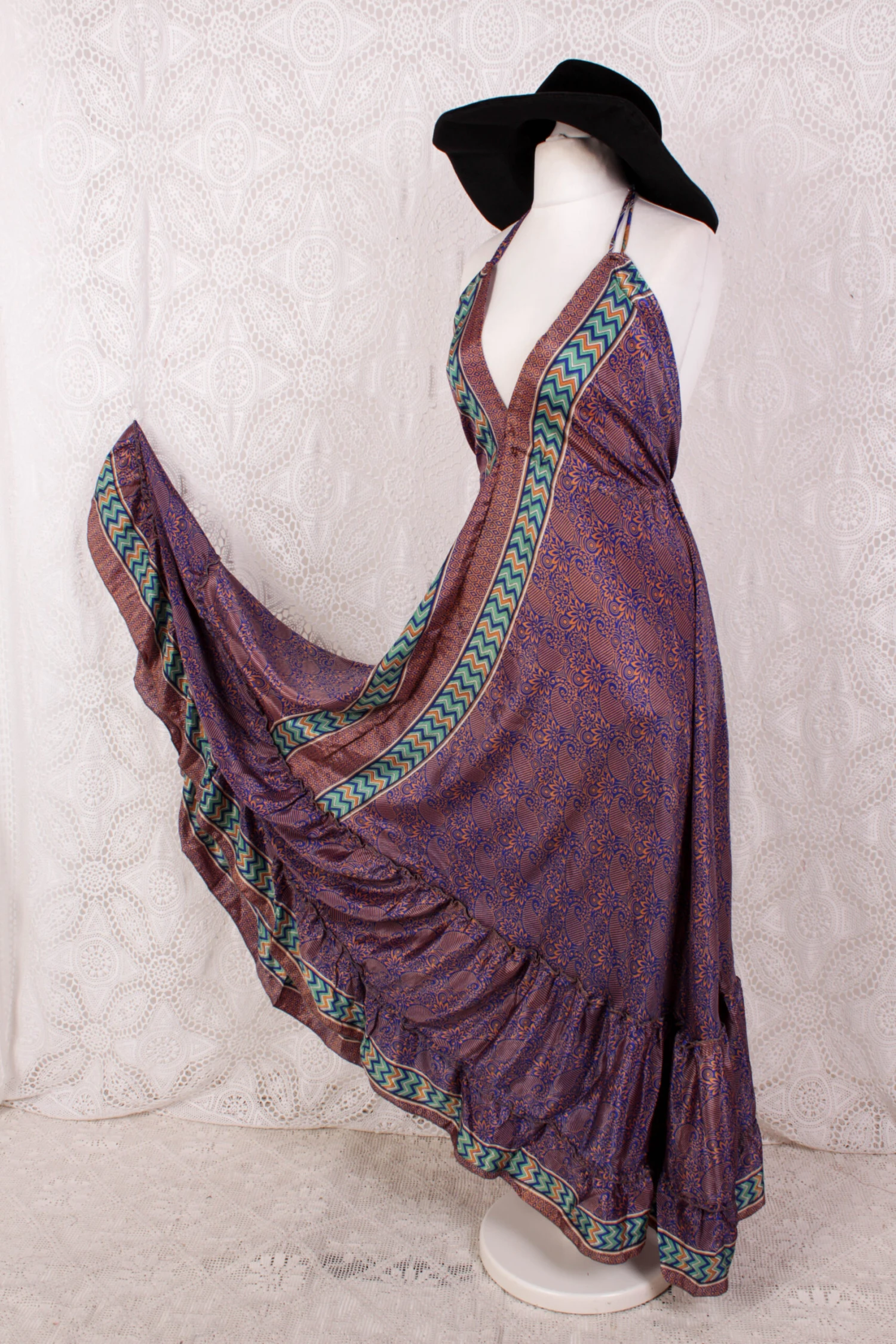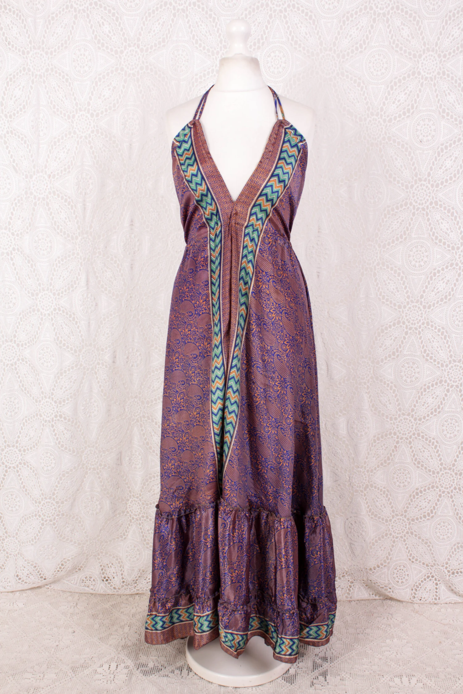 Stunning bohemian halter-neck maxi dress with a tiered frill skirt.