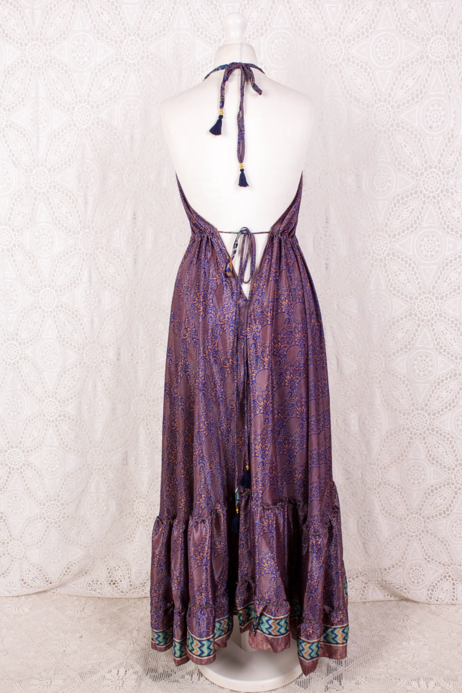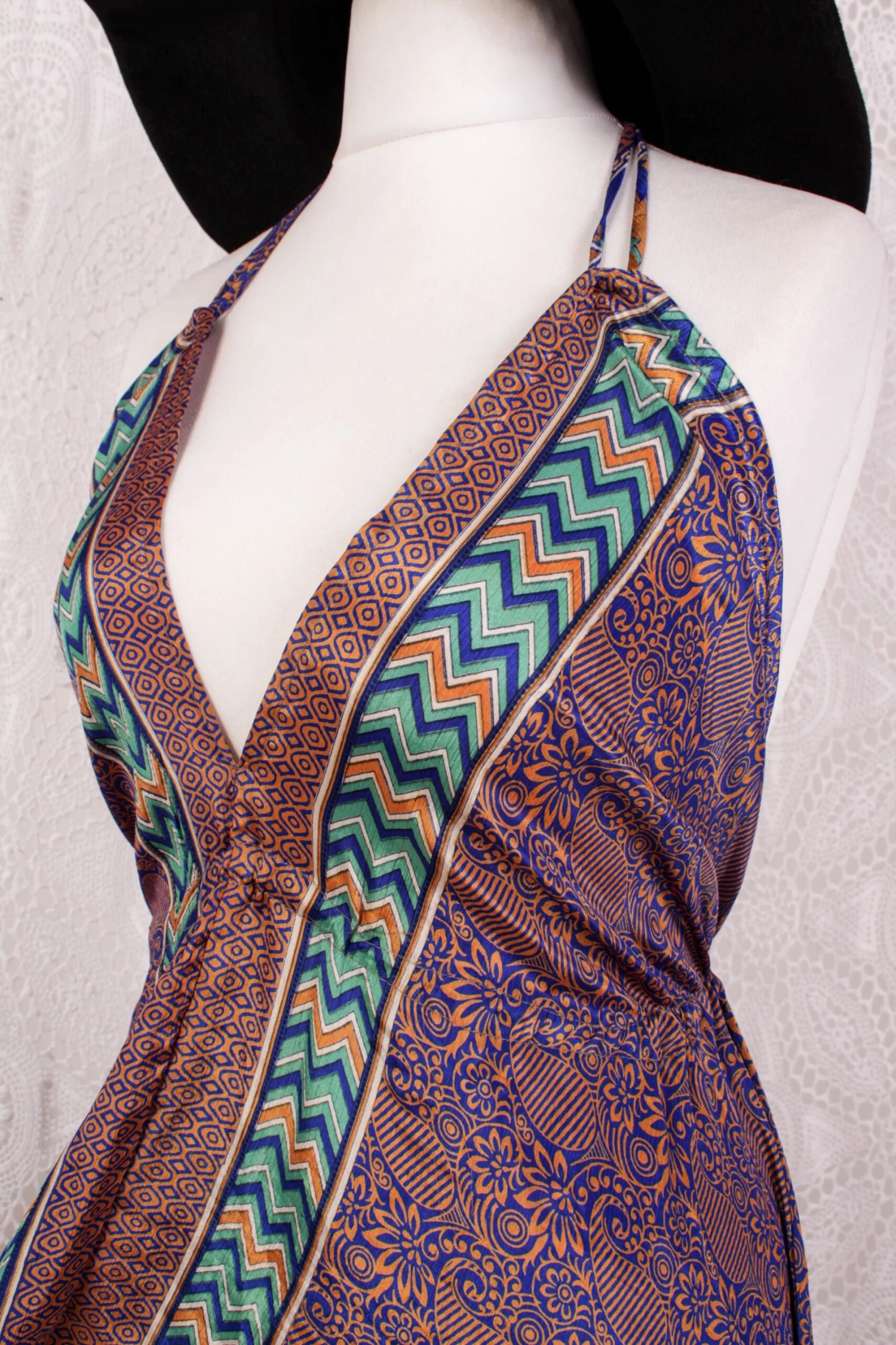 Made from vintage recycled Indian fabrics. Super soft silky material with a gorgeous colour and print. It has adjustable ribbon ties at the neck and waist to fit you perfectly.