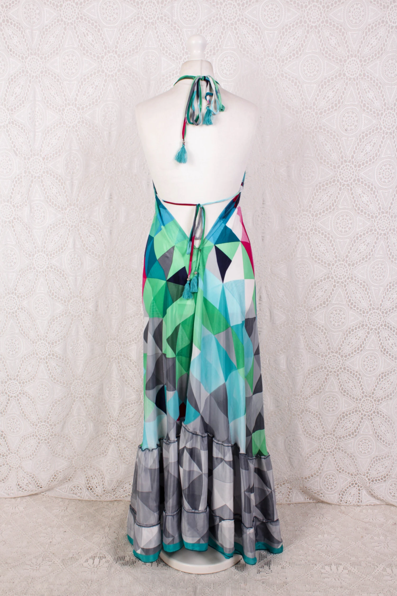 Stunning bohemian halter-neck maxi dress with a tiered frill skirt.