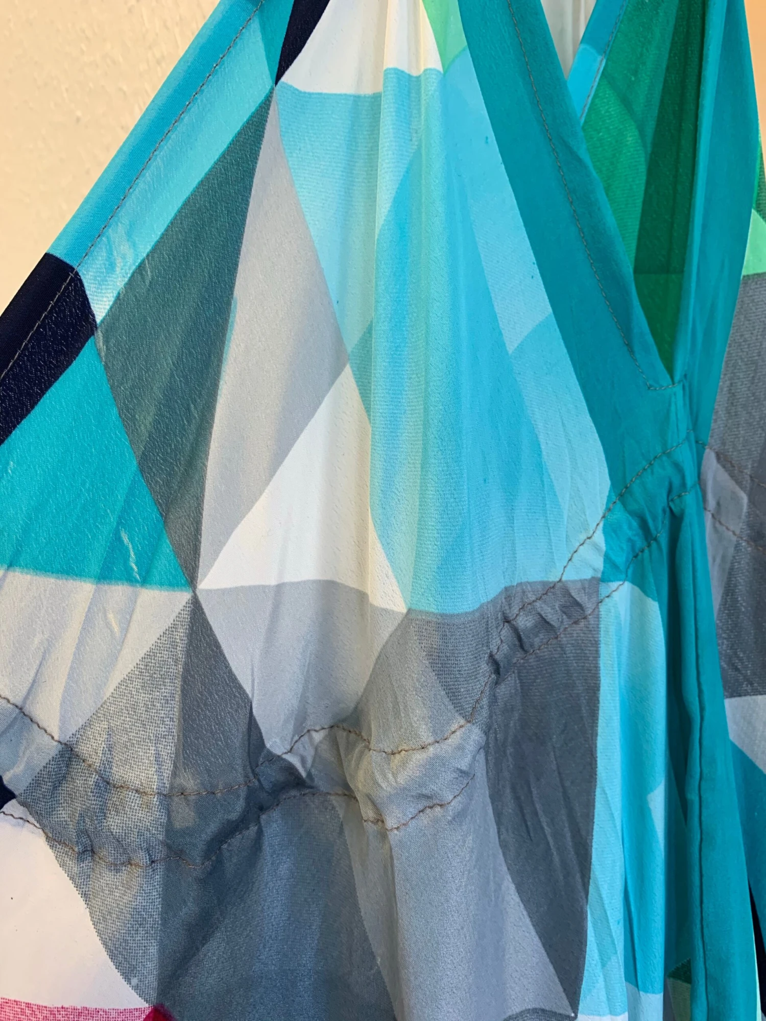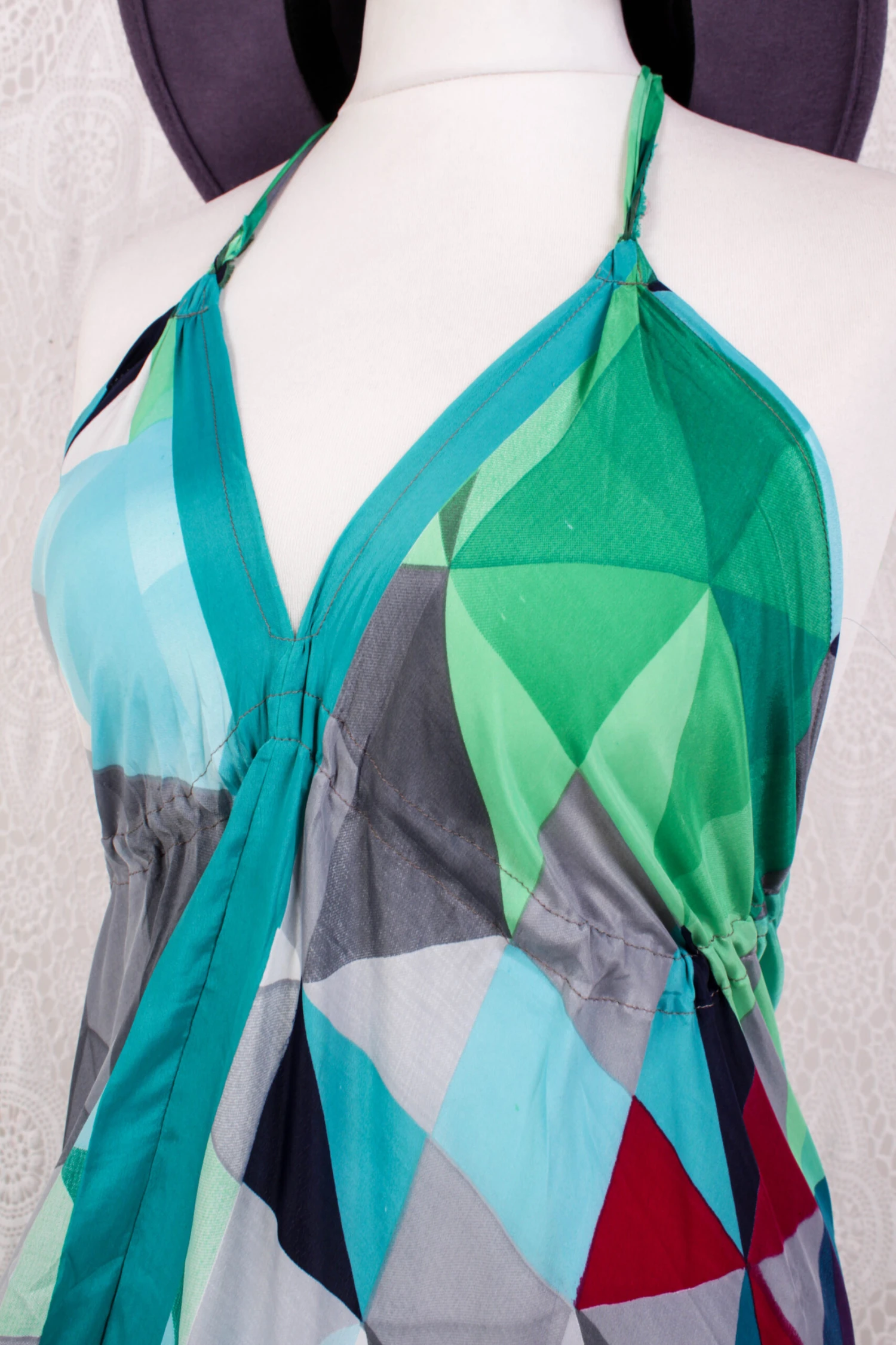 Made from vintage recycled Indian fabrics. Super soft silky material with a gorgeous colour and print. It has adjustable ribbon ties at the neck and waist to fit you perfectly.