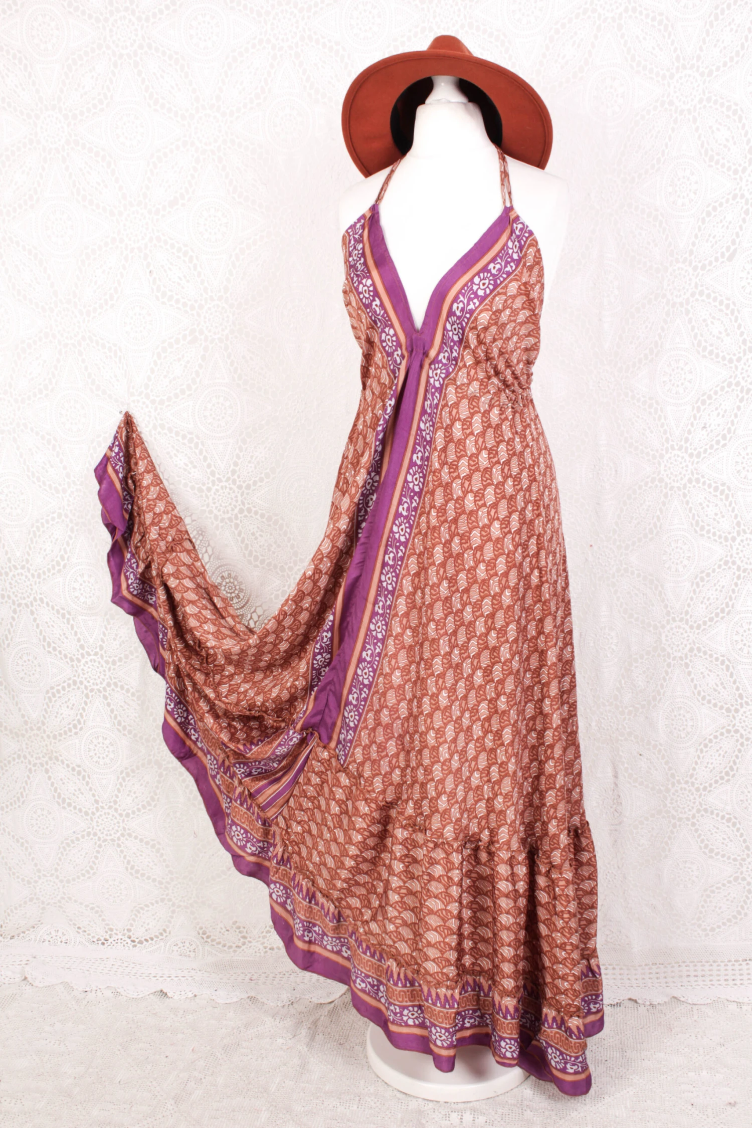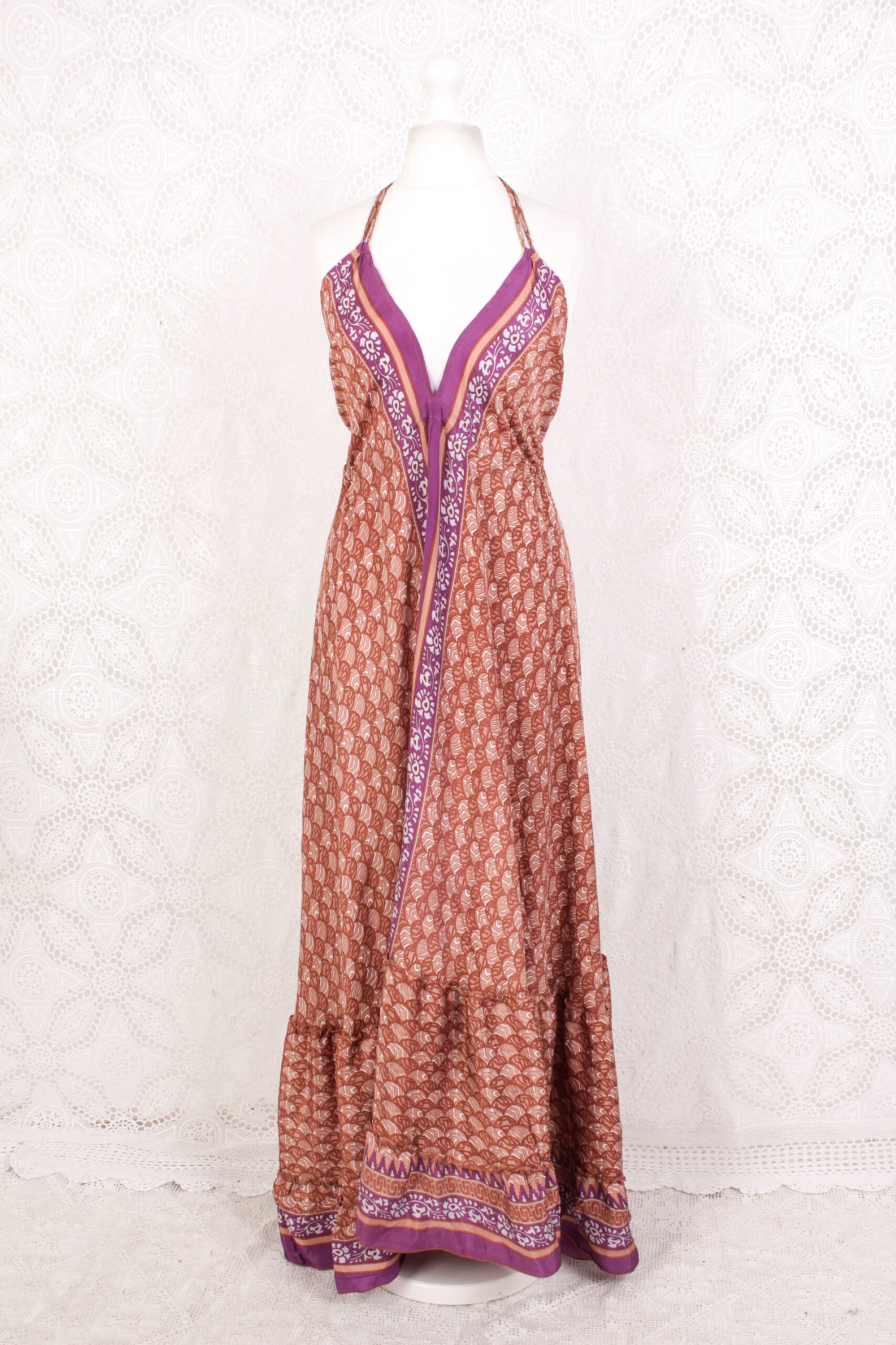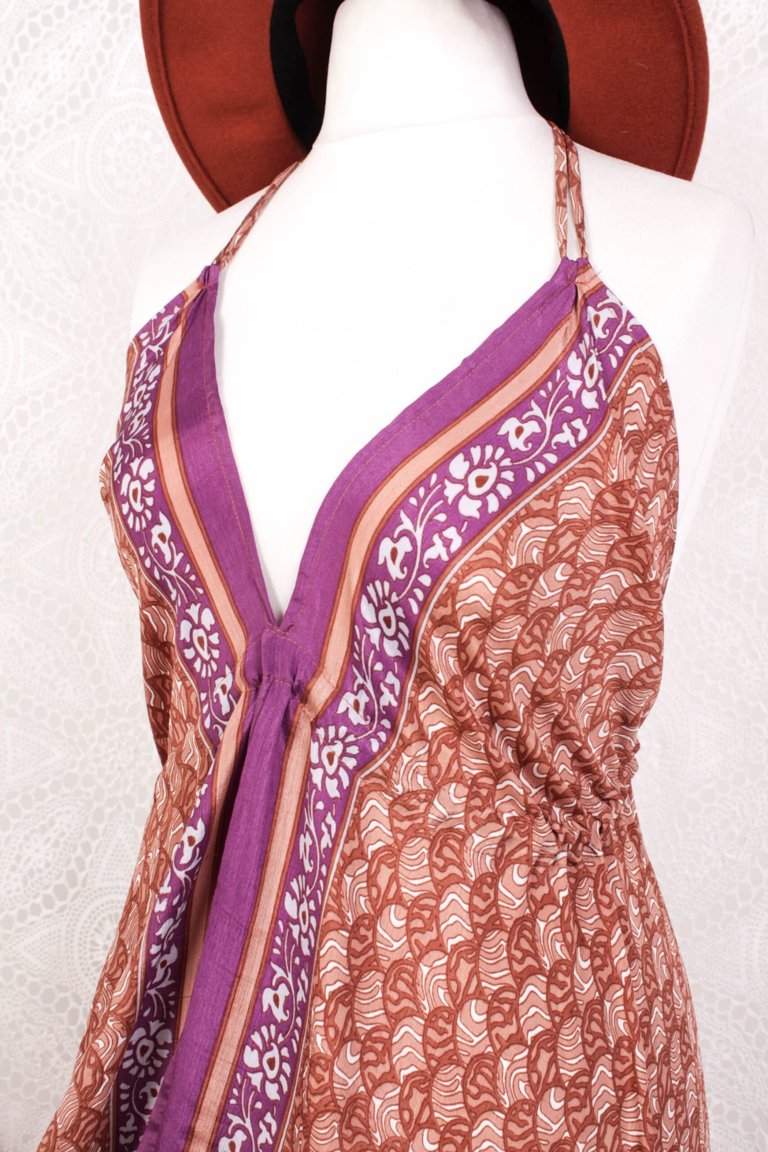 Made from vintage recycled Indian fabrics. Super soft silky material with a gorgeous colour and print. It has adjustable ribbon ties at the neck and waist to fit you perfectly.