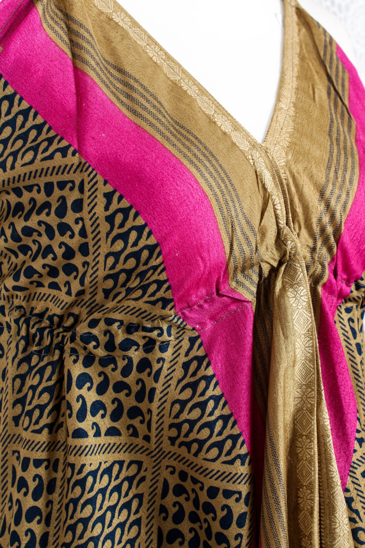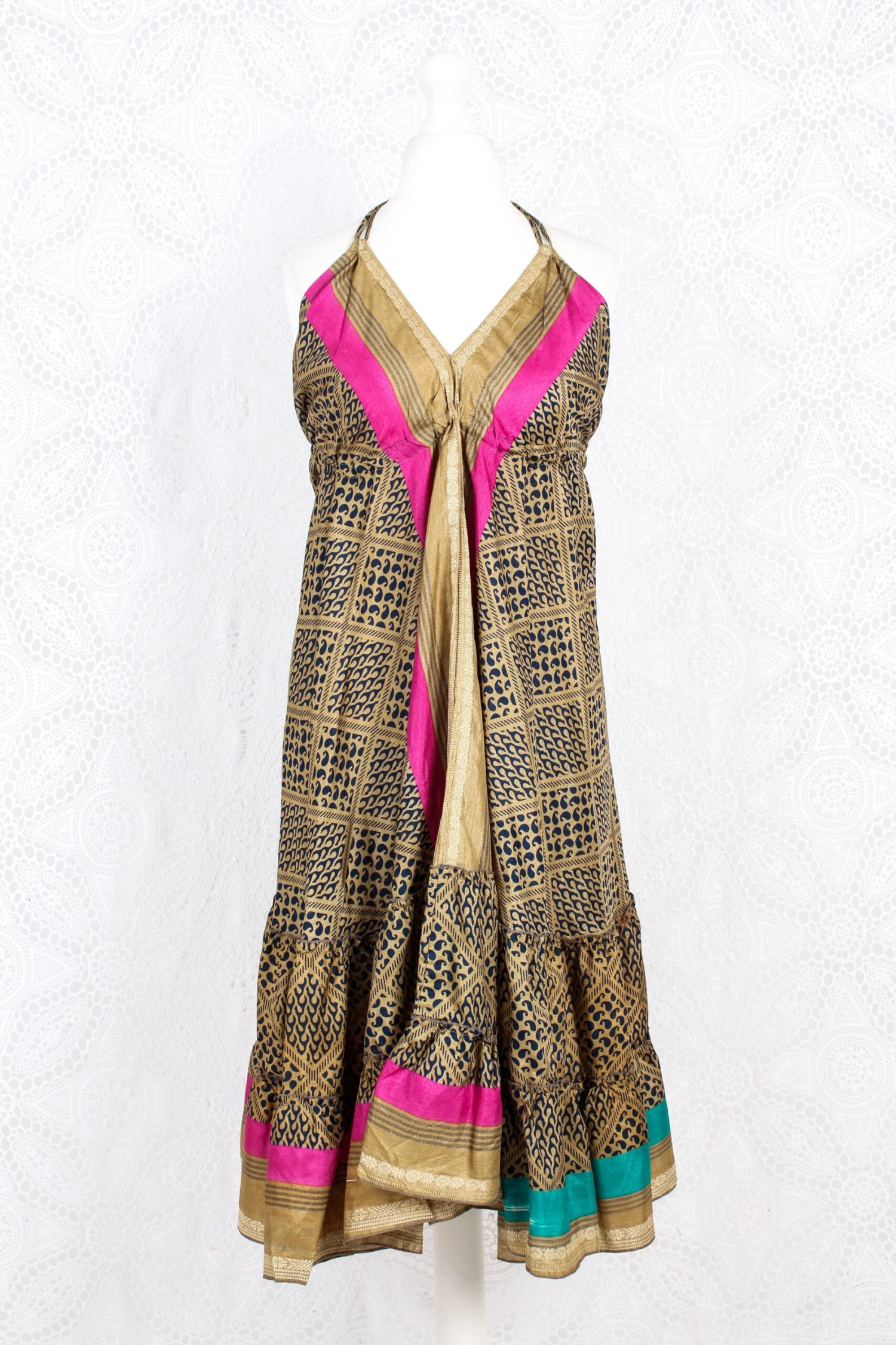 Stunning halter-neck mini dress, re-made from vintage recycled Indian fabrics. Super soft silky material with a frill tiered skirt. Tassels at the neck and as a drawstring waist to adjust the size. Falls just above or below the knee depending on your height.