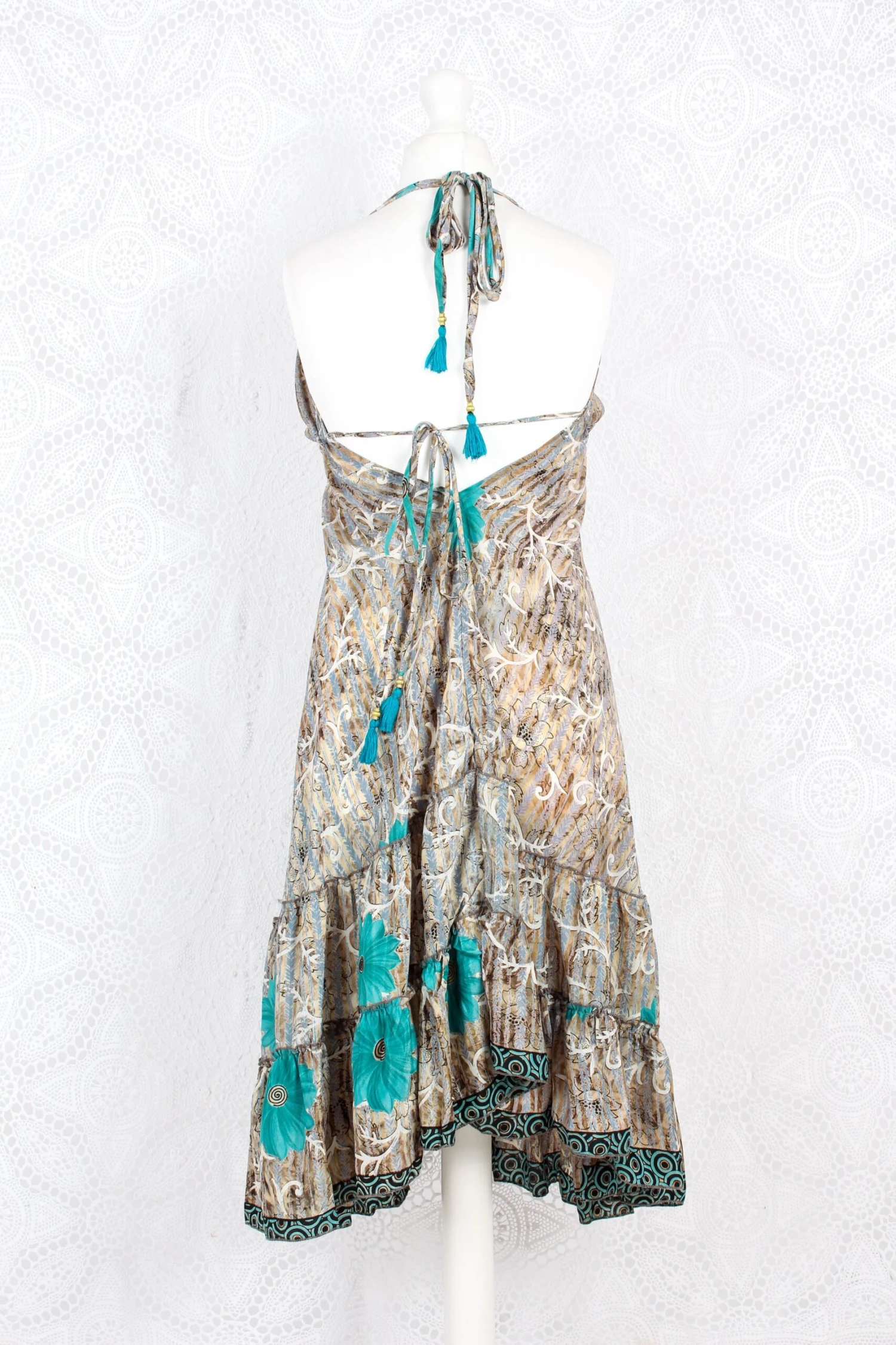 Stunning halter-neck mini dress, re-made from vintage recycled Indian fabrics. Super soft silky material with a frill tiered skirt. Tassels at the neck and as a drawstring waist to adjust the size. Falls just above or below the knee depending on your height.