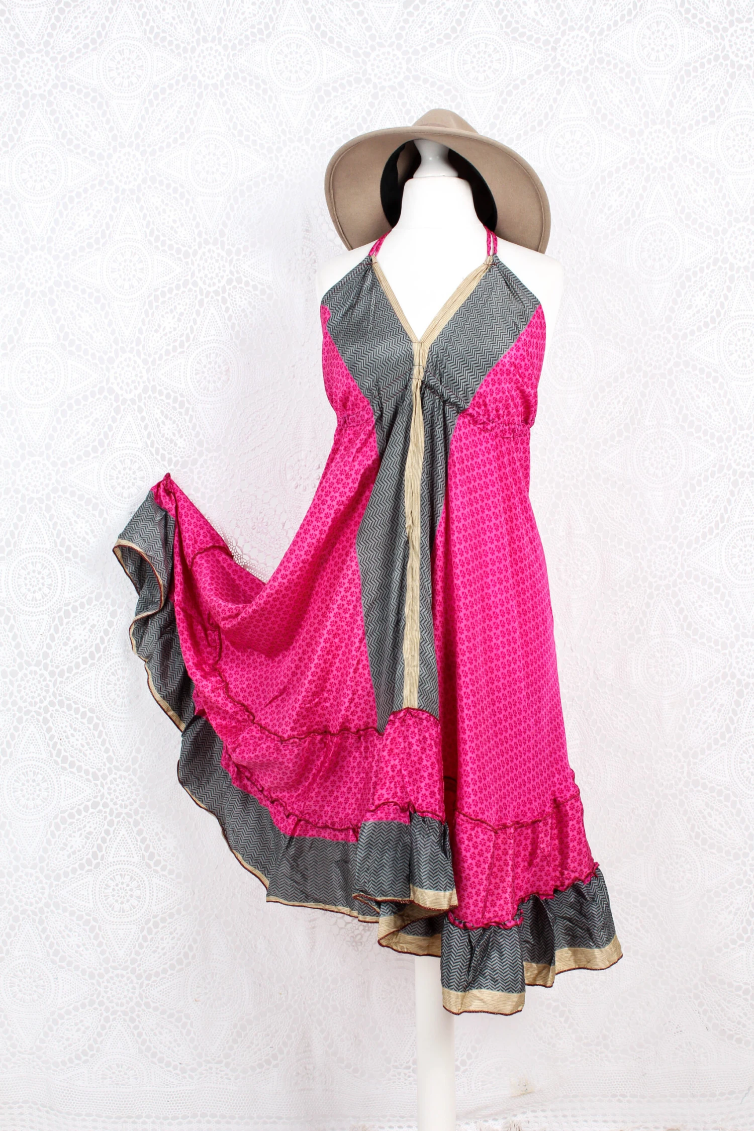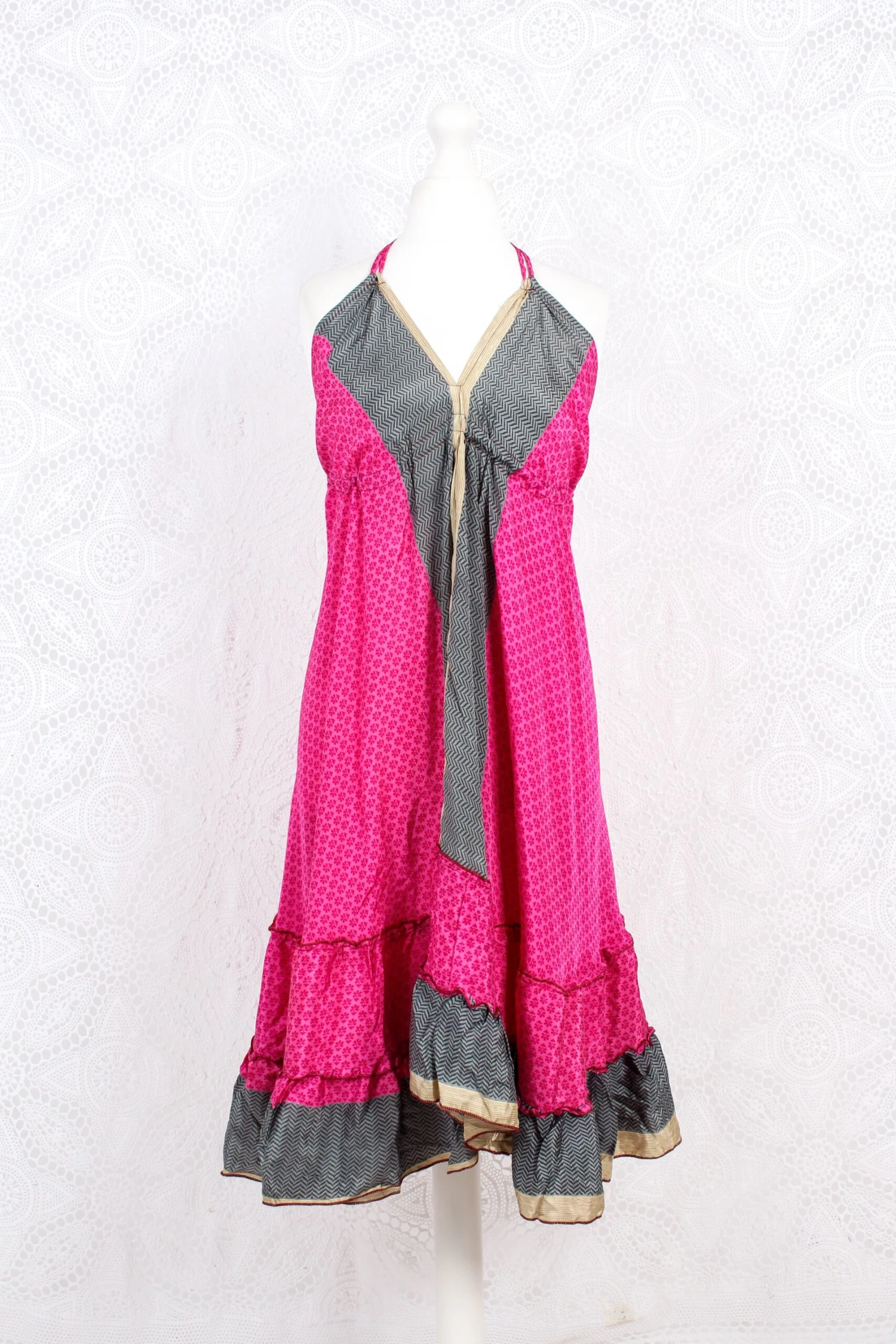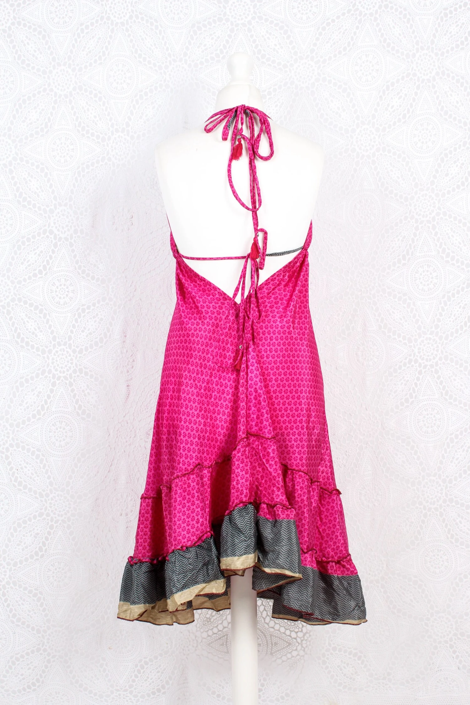 Stunning halter-neck mini dress, re-made from vintage recycled Indian fabrics. Super soft silky material with a frill tiered skirt. Tassels at the neck and as a drawstring waist to adjust the size. Falls just above or below the knee depending on your height.