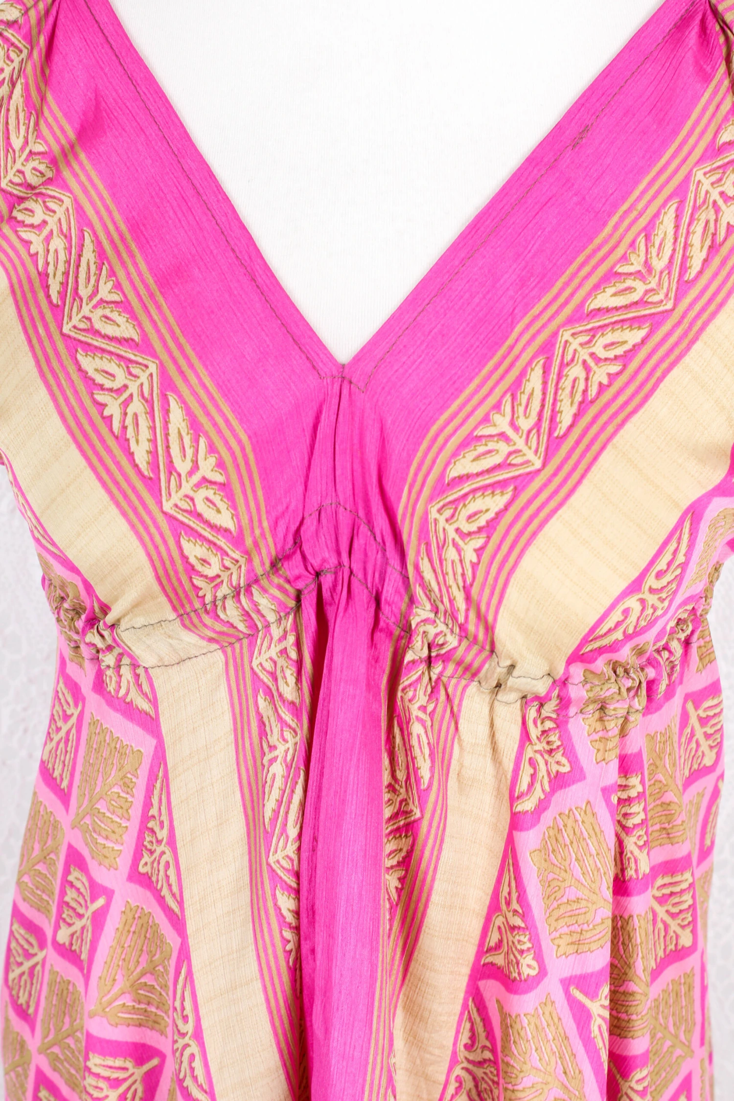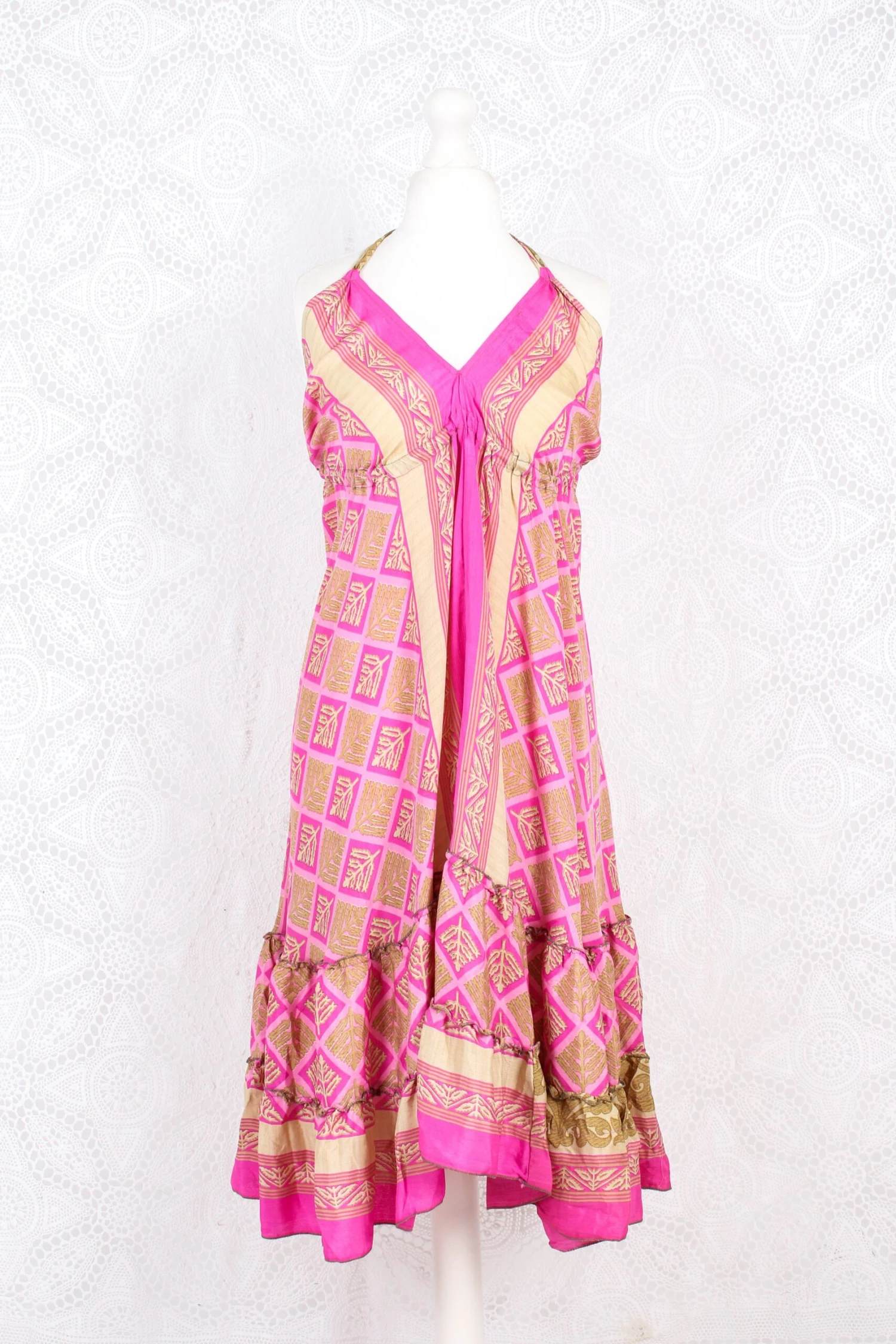 Stunning halter-neck mini dress, re-made from vintage recycled Indian fabrics. Super soft silky material with a frill tiered skirt. Tassels at the neck and as a drawstring waist to adjust the size. Falls just above or below the knee depending on your height.