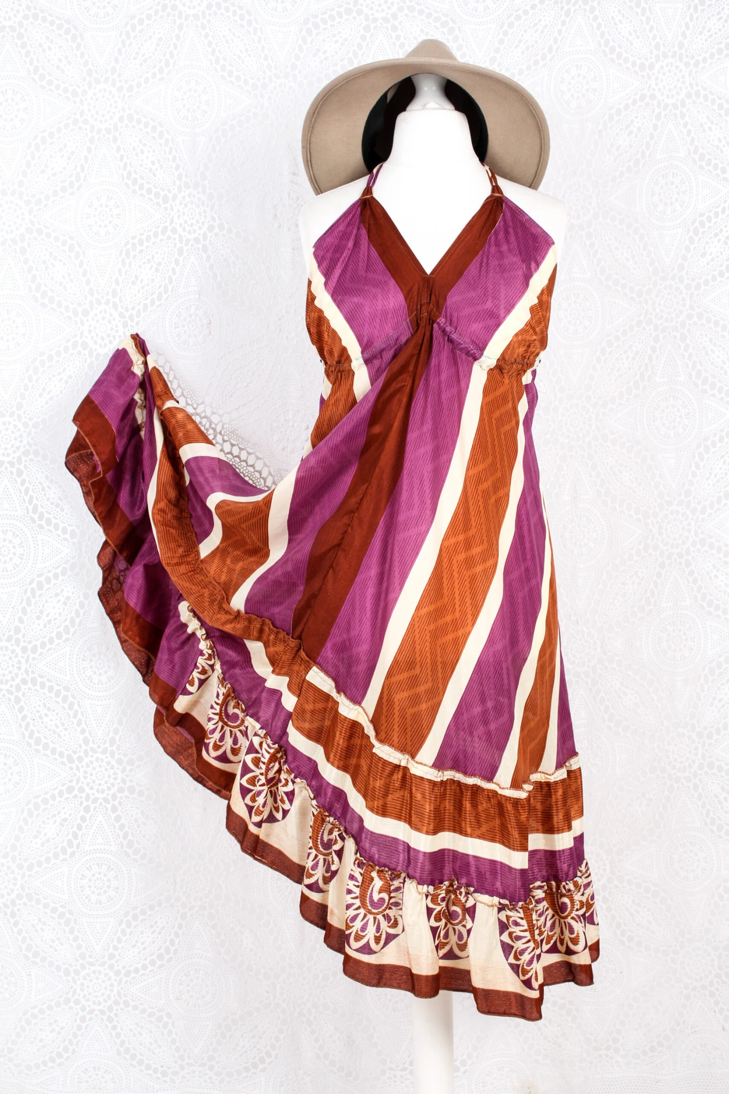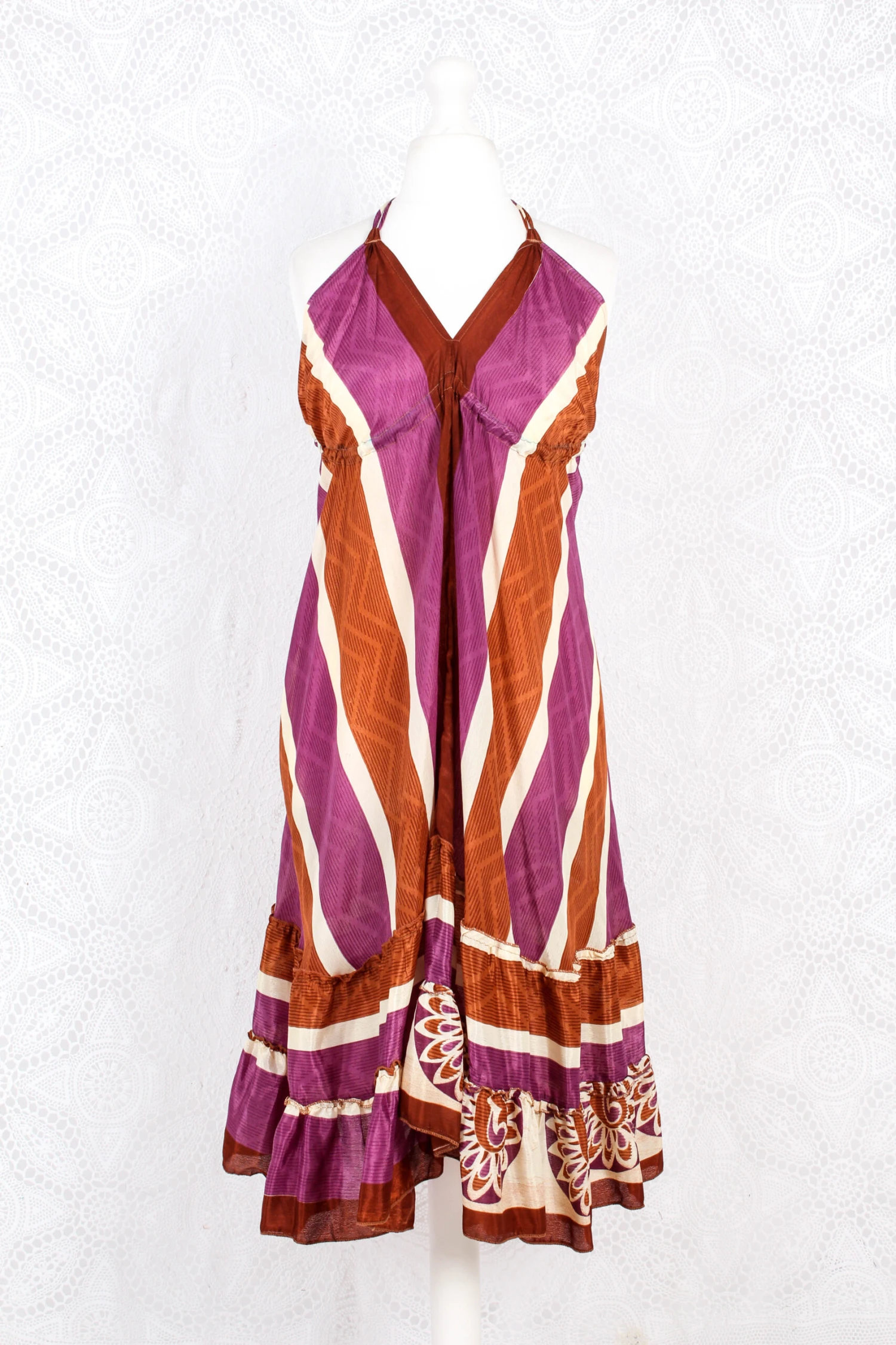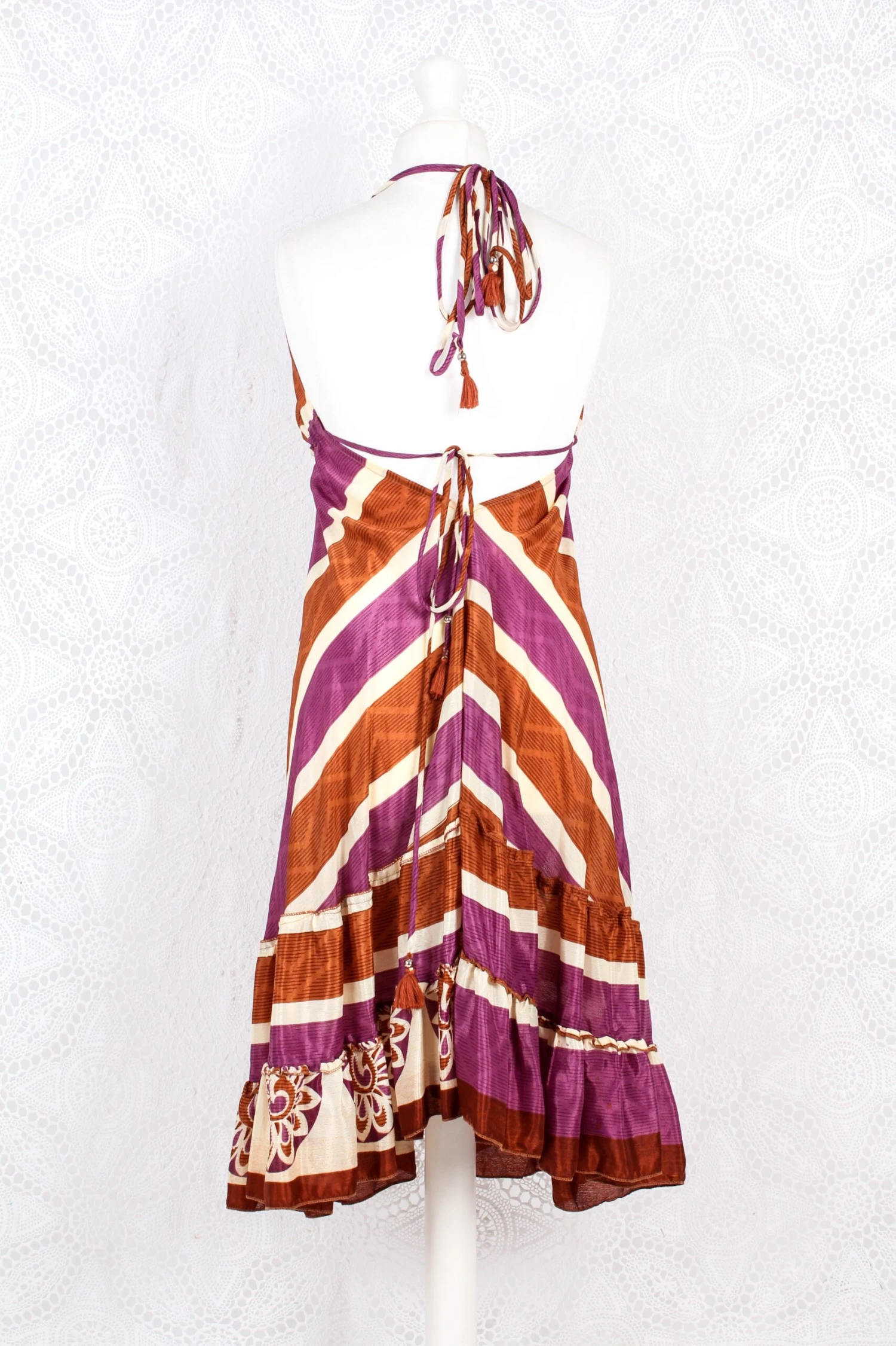 Stunning halter-neck mini dress, re-made from vintage recycled Indian fabrics. Super soft silky material with a frill tiered skirt. Tassels at the neck and as a drawstring waist to adjust the size. Falls just above or below the knee depending on your height.