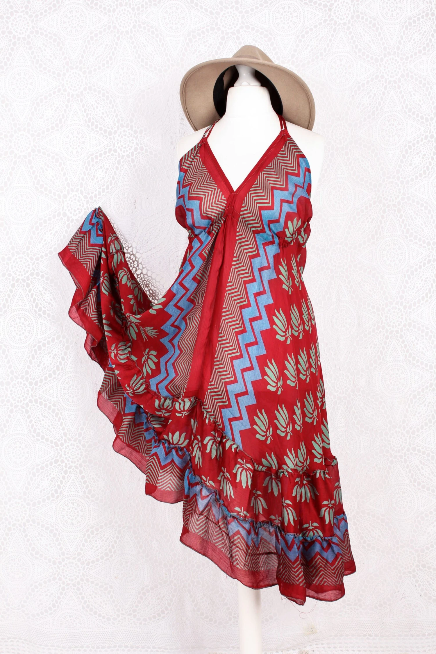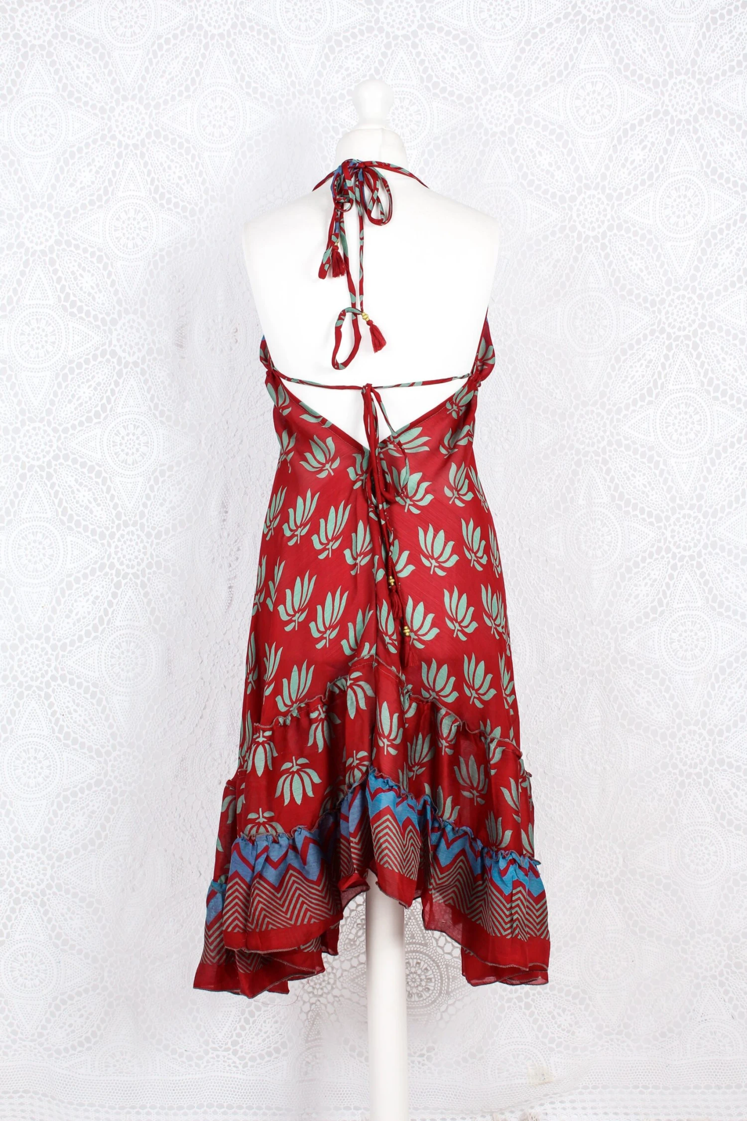 Stunning halter-neck mini dress, re-made from vintage recycled Indian fabrics. Super soft silky material with a frill tiered skirt. Tassels at the neck and as a drawstring waist to adjust the size. Falls just above or below the knee depending on your height.