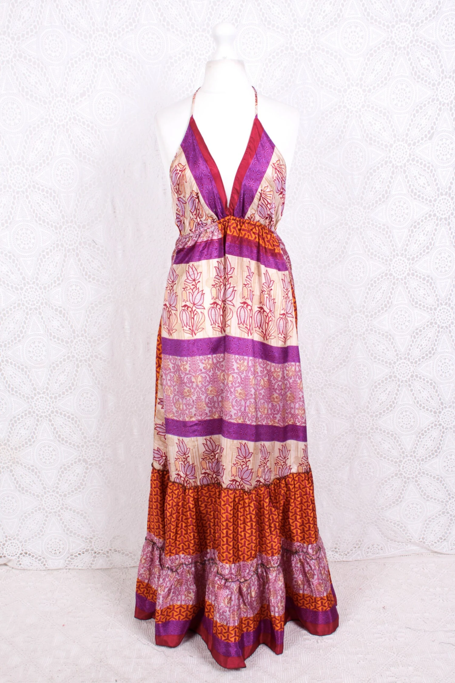 Stunning bohemian halter-neck maxi dress with a tiered frill skirt.