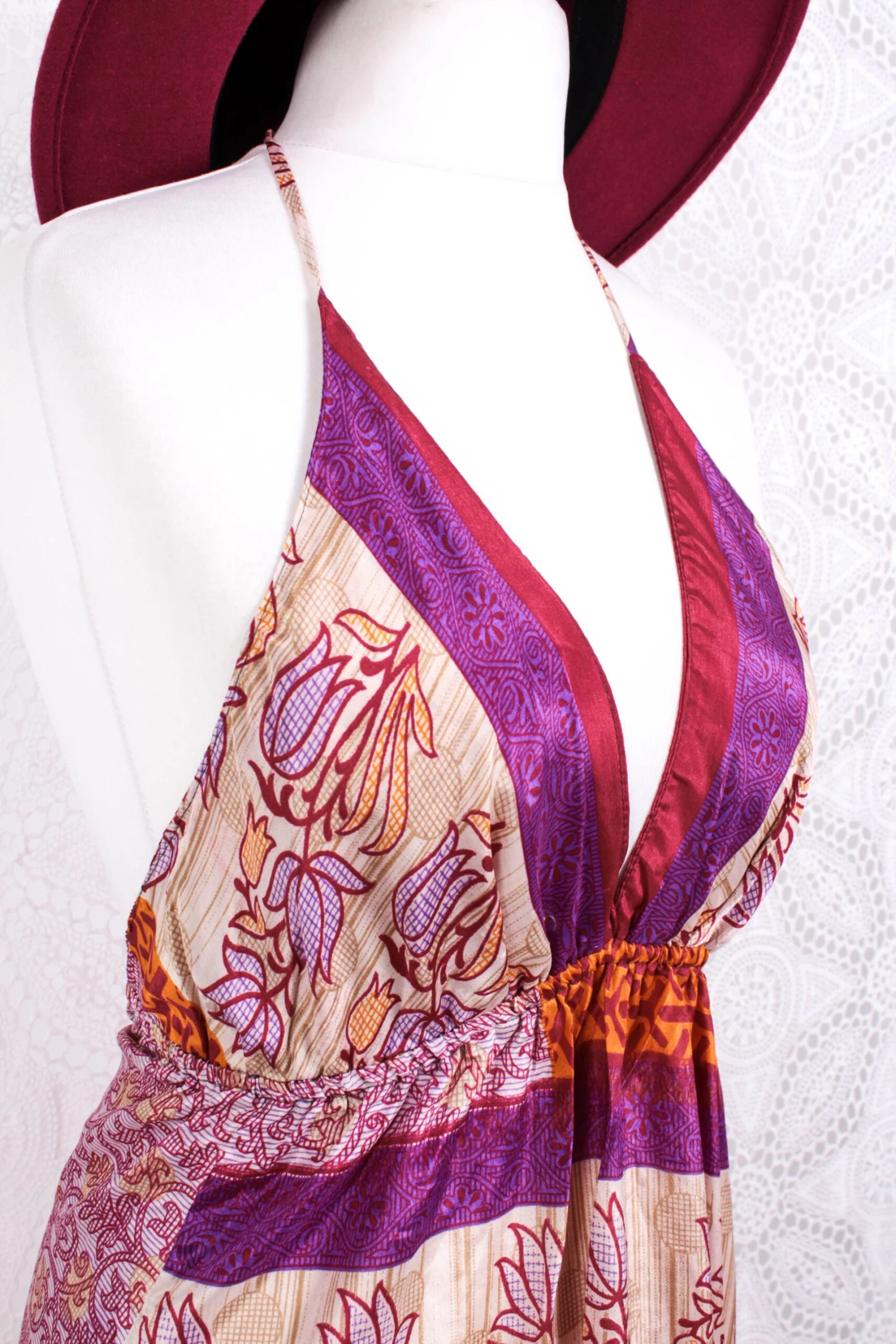 Made from vintage recycled Indian fabrics. Super soft silky material with a gorgeous colour and print. It has adjustable ribbon ties at the neck and waist to fit you perfectly.