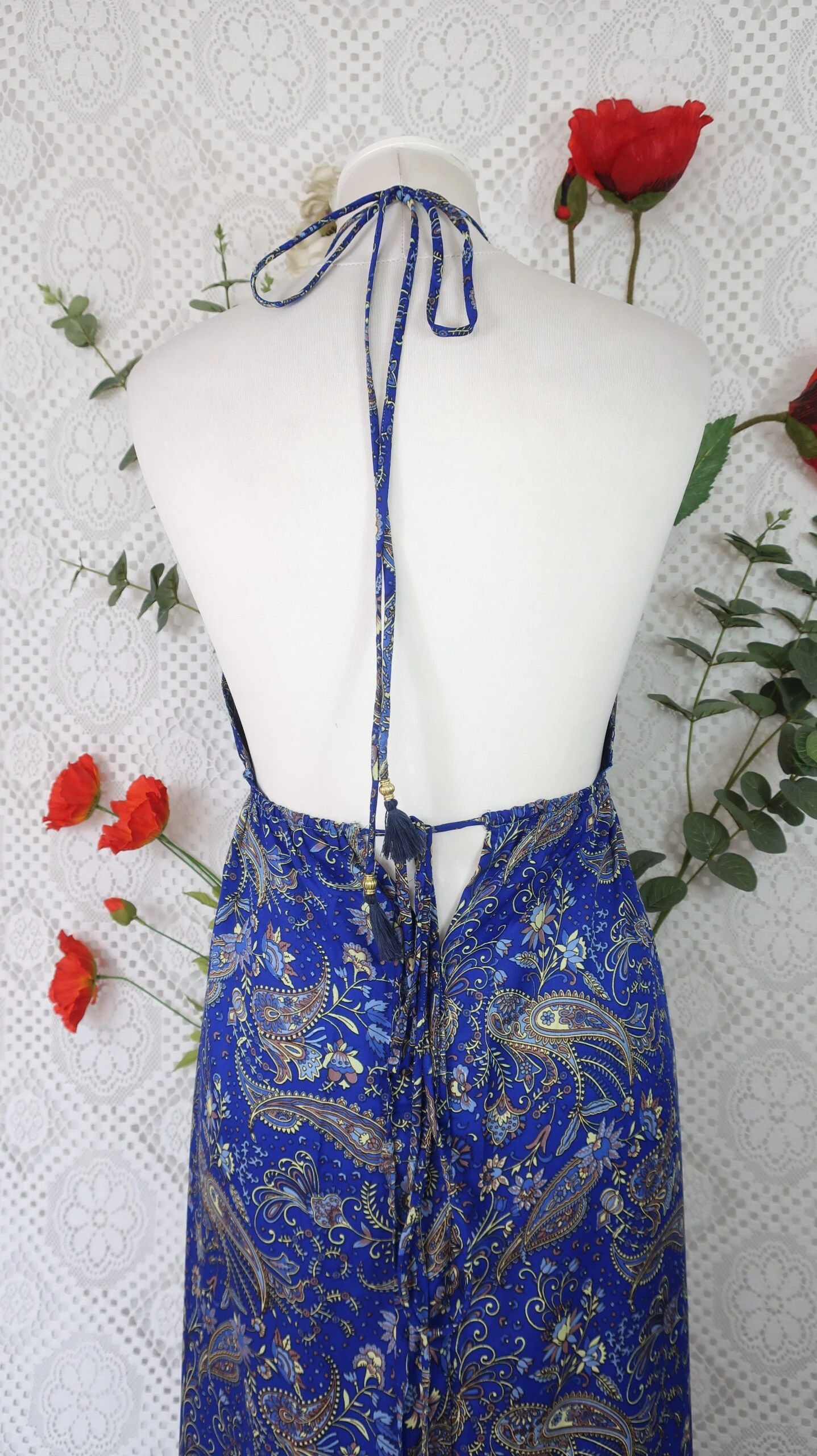 Made from vintage recycled Indian fabrics. Super soft silky material with a gorgeous colour and print. It has adjustable ribbon ties at the neck and waist to fit you perfectly.