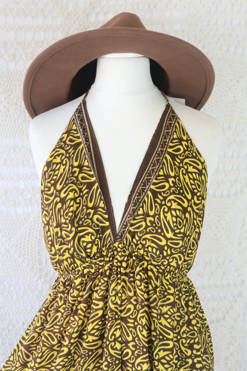 Stunning bohemian halter-neck midi dress with a tiered frill skirt.