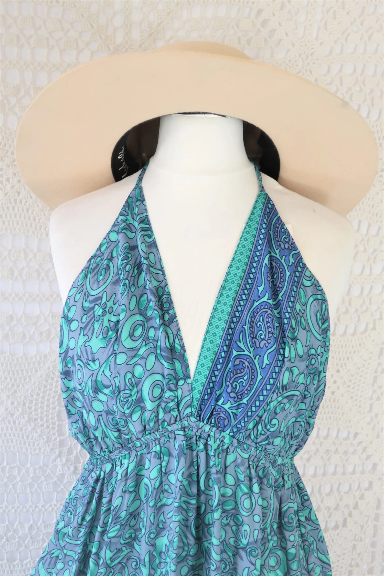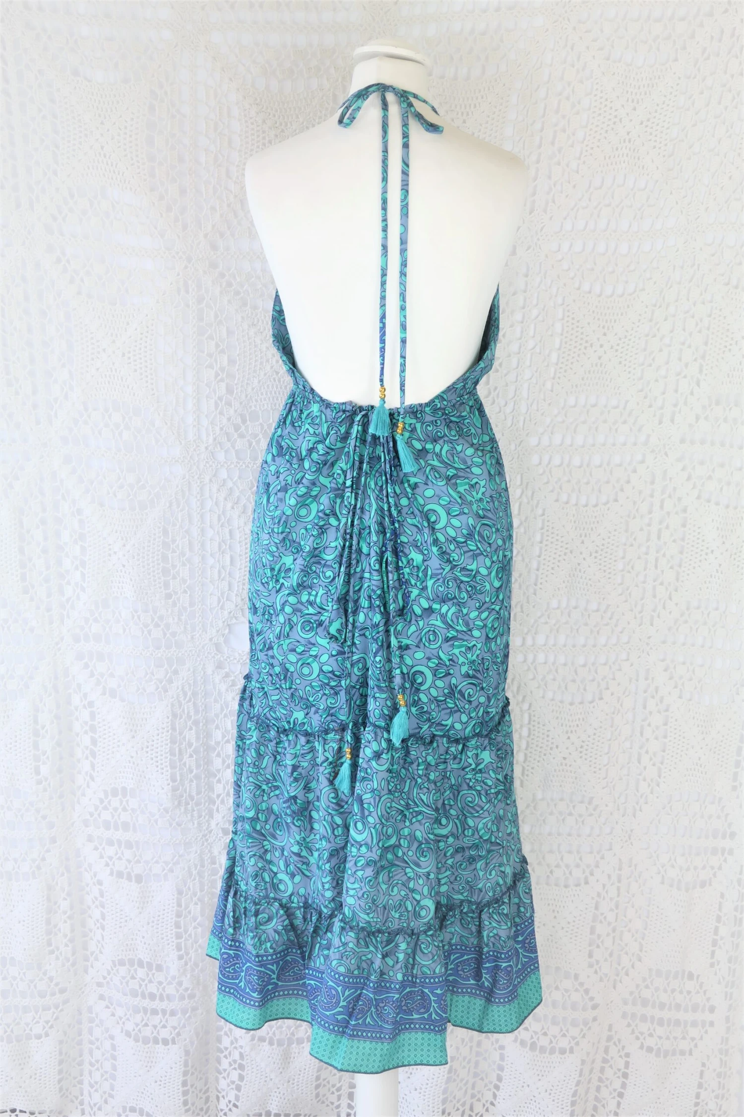 Made from vintage recycled Indian fabrics. Super soft silky material with a gorgeous colour and print. It has adjustable ribbon ties at the neck and waist to fit you perfectly.