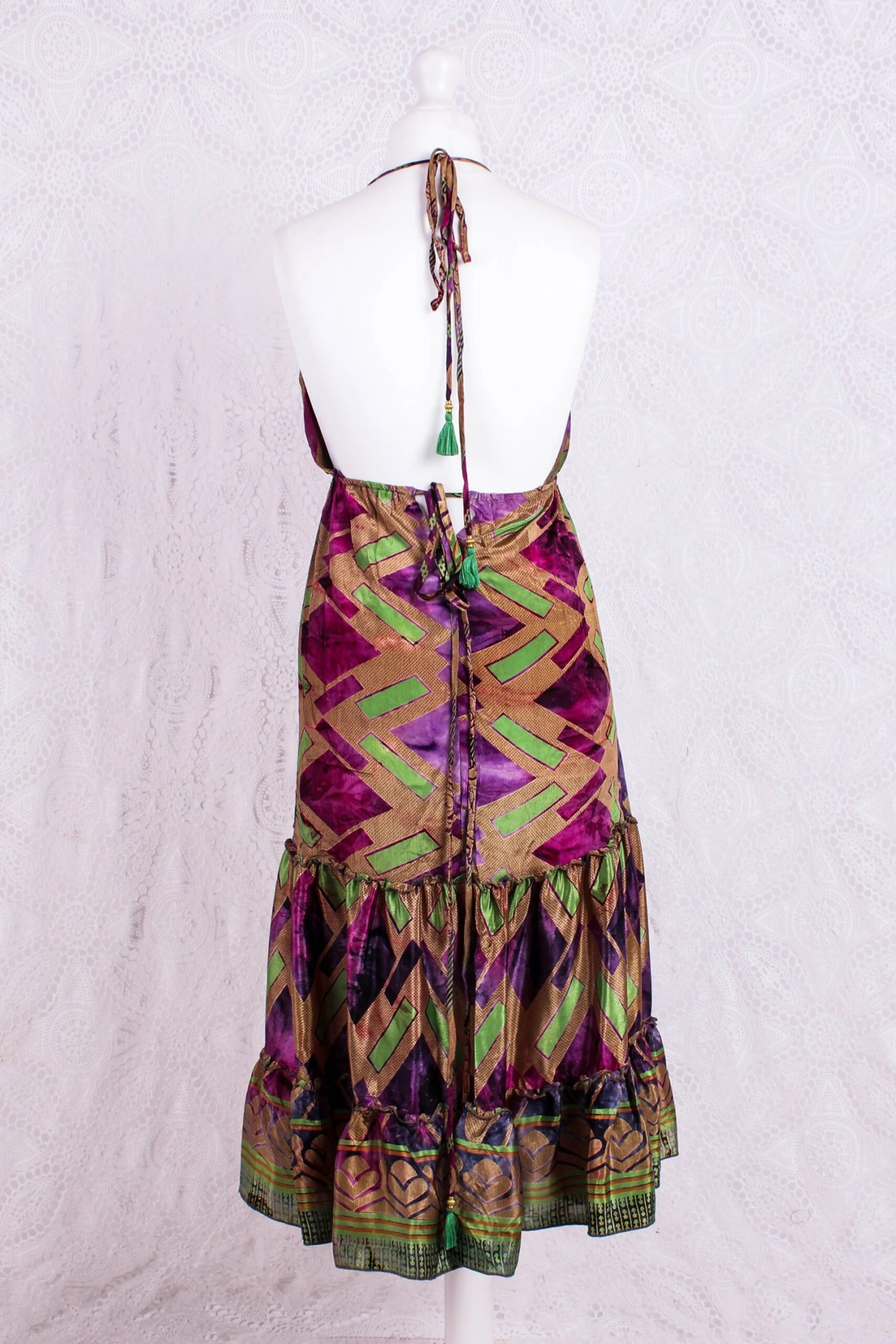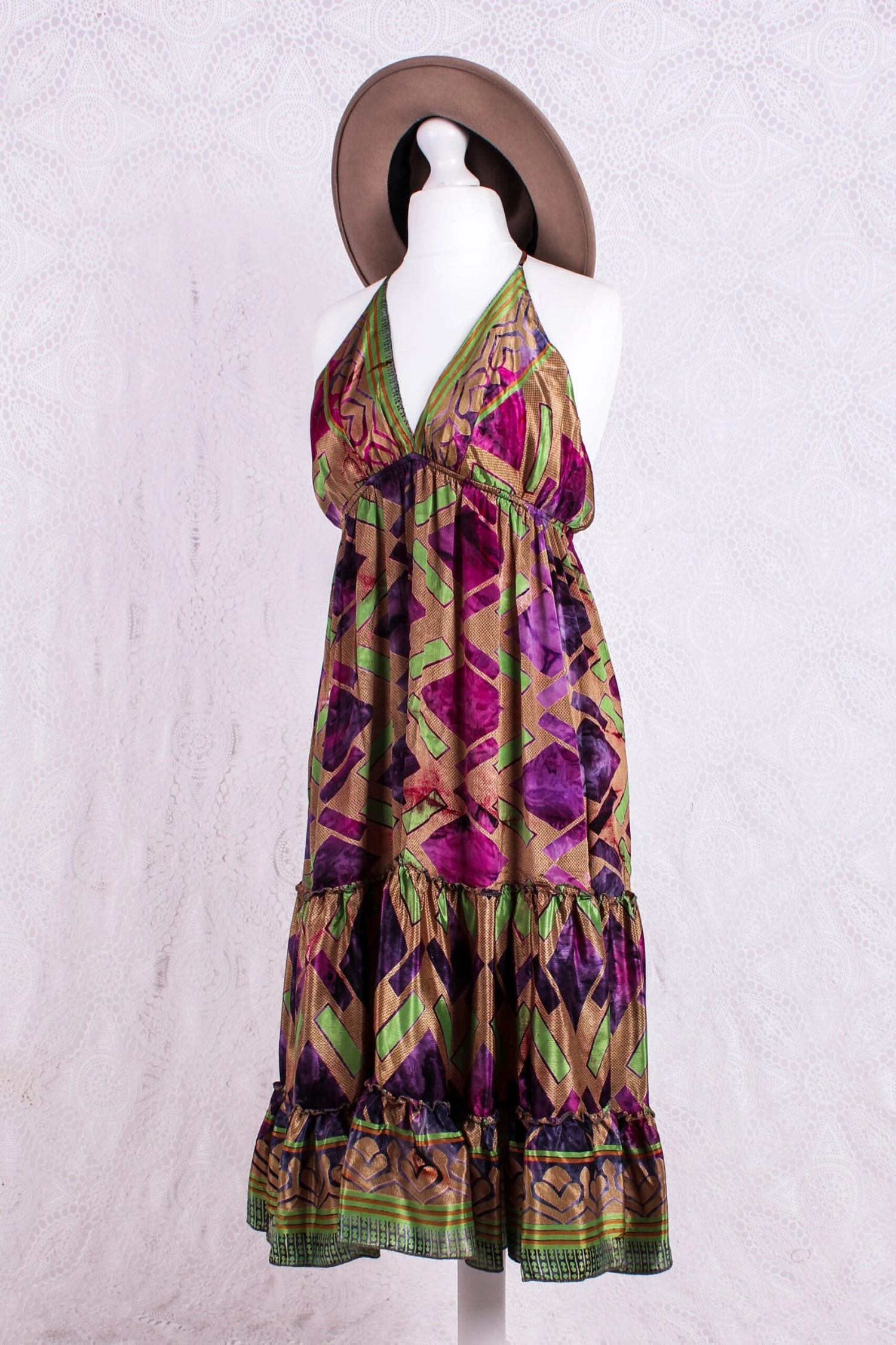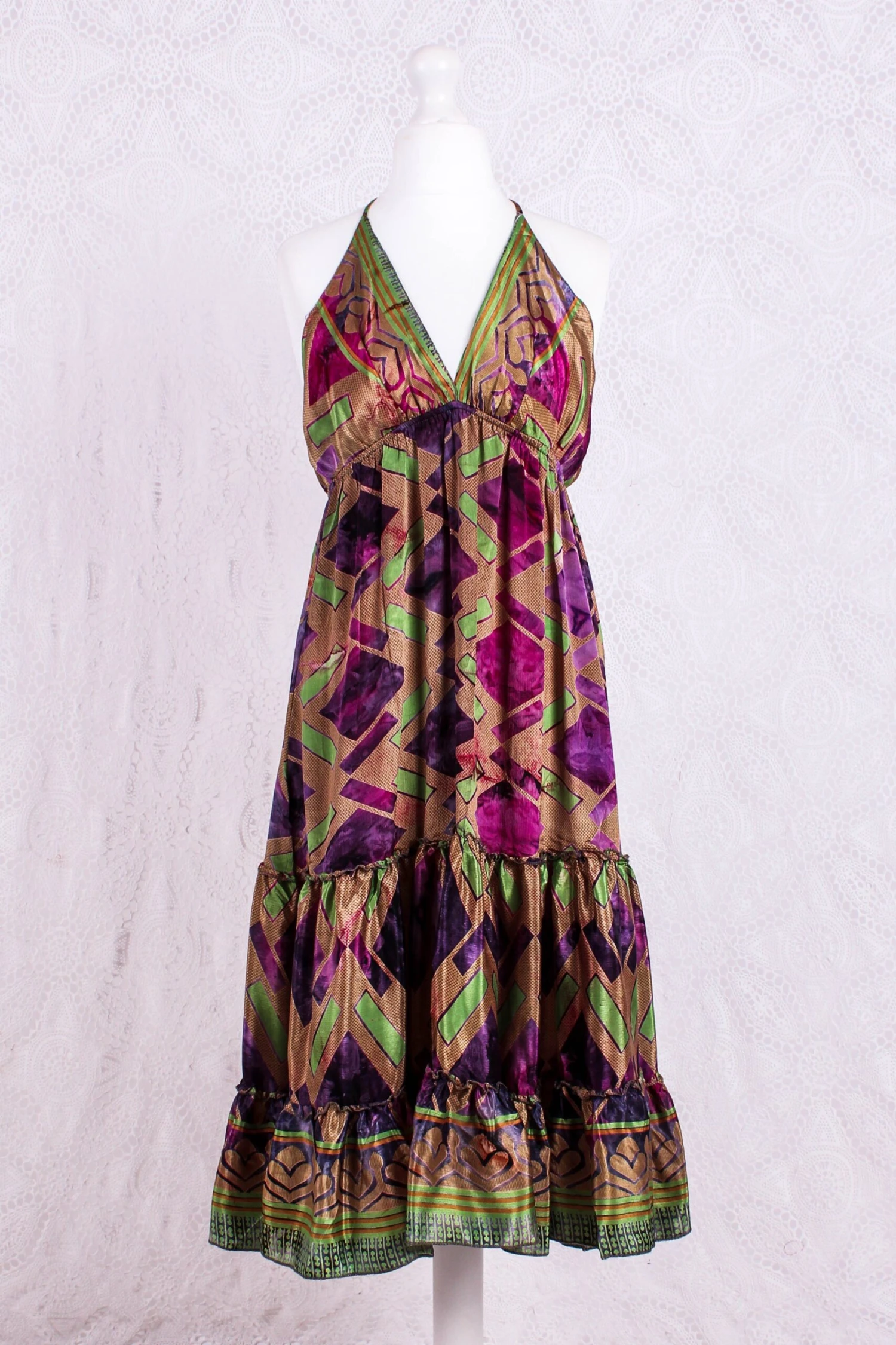 Stunning halter-neck mini dress, re-made from vintage recycled Indian fabrics. Super soft silky material with a gorgeous colour and print. Tassels at the neck and as a drawstring waist to adjust the size.