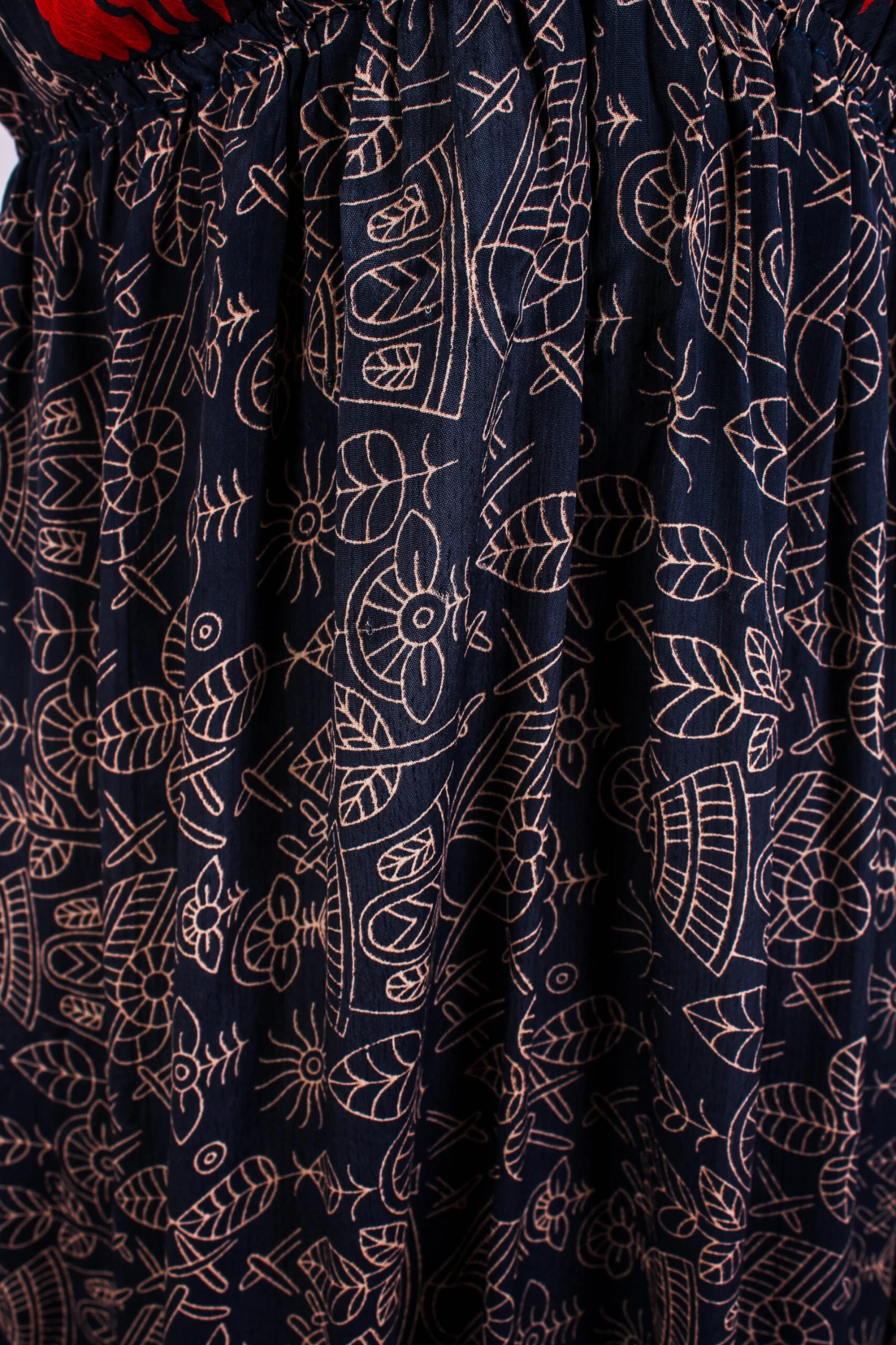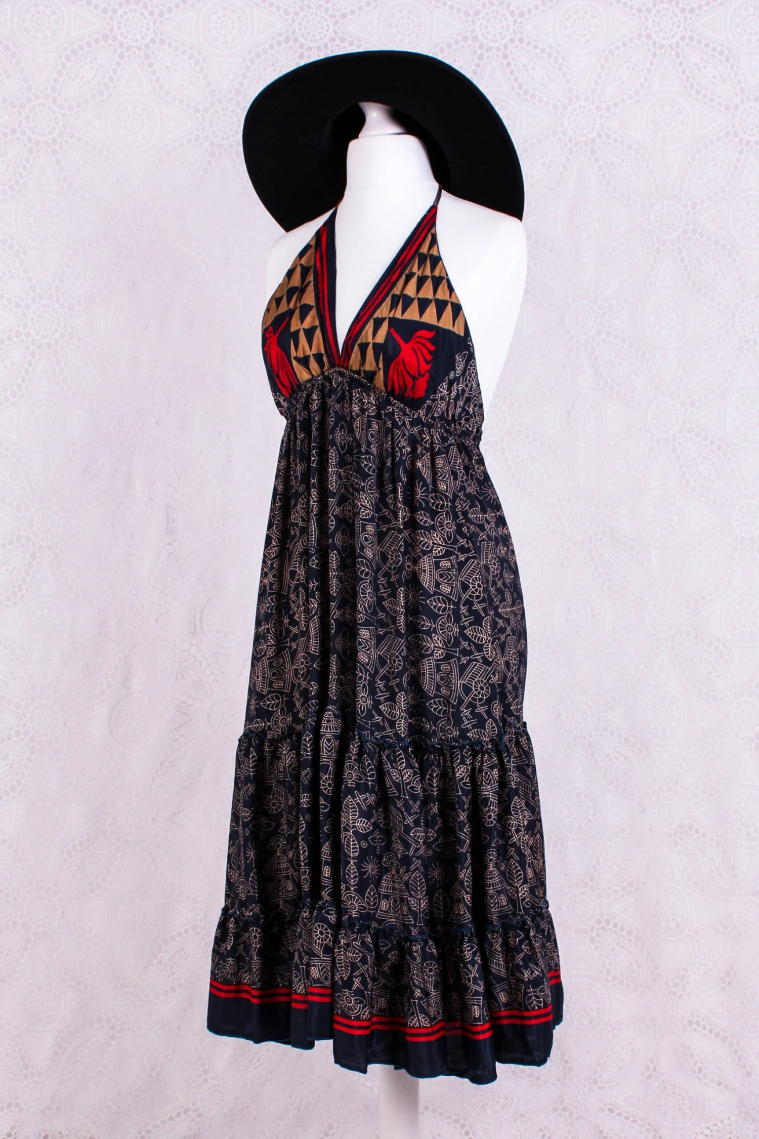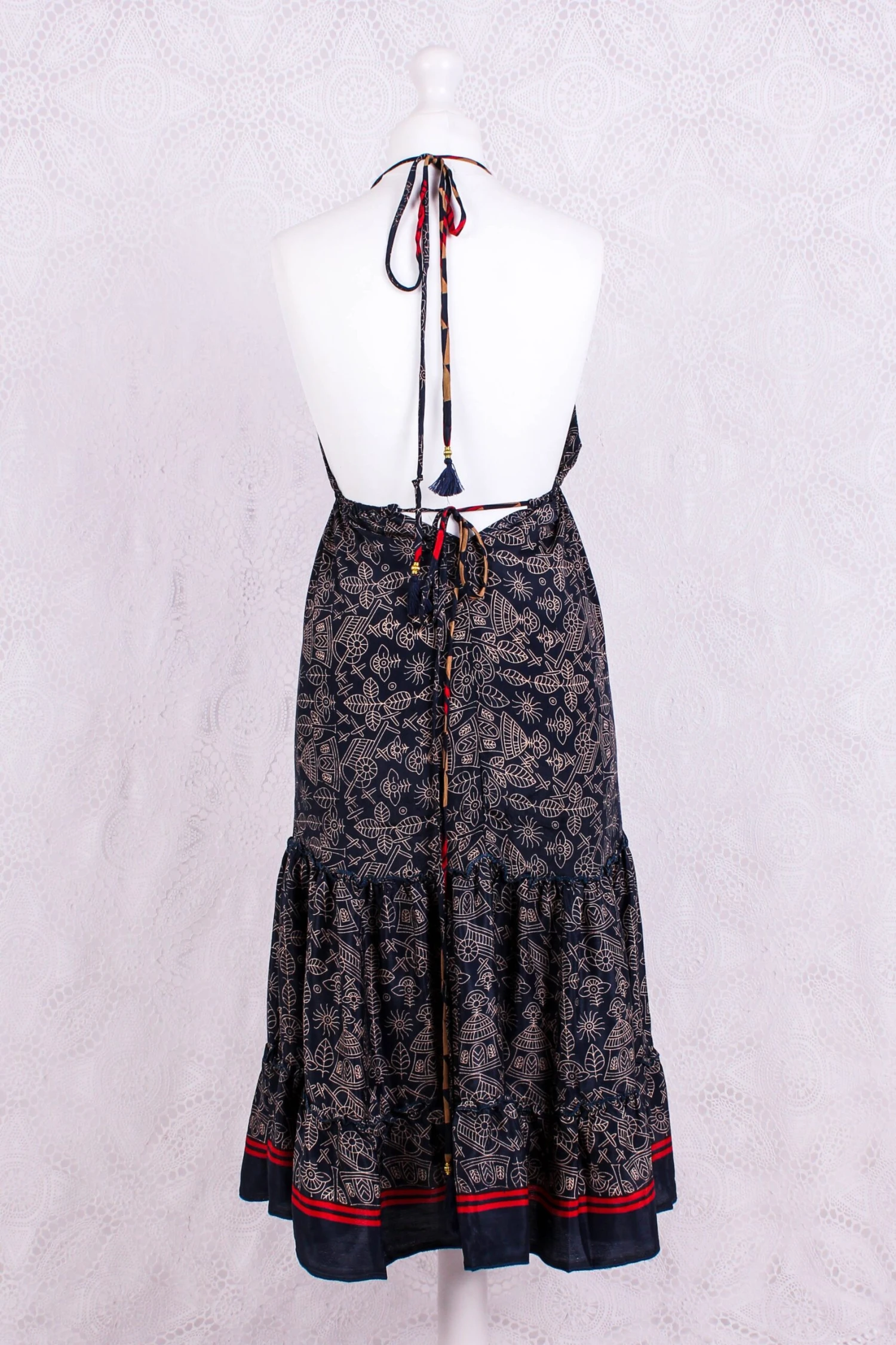 Stunning halter-neck mini dress, re-made from vintage recycled Indian fabrics. Super soft silky material with a gorgeous colour and print. Tassels at the neck and as a drawstring waist to adjust the size.