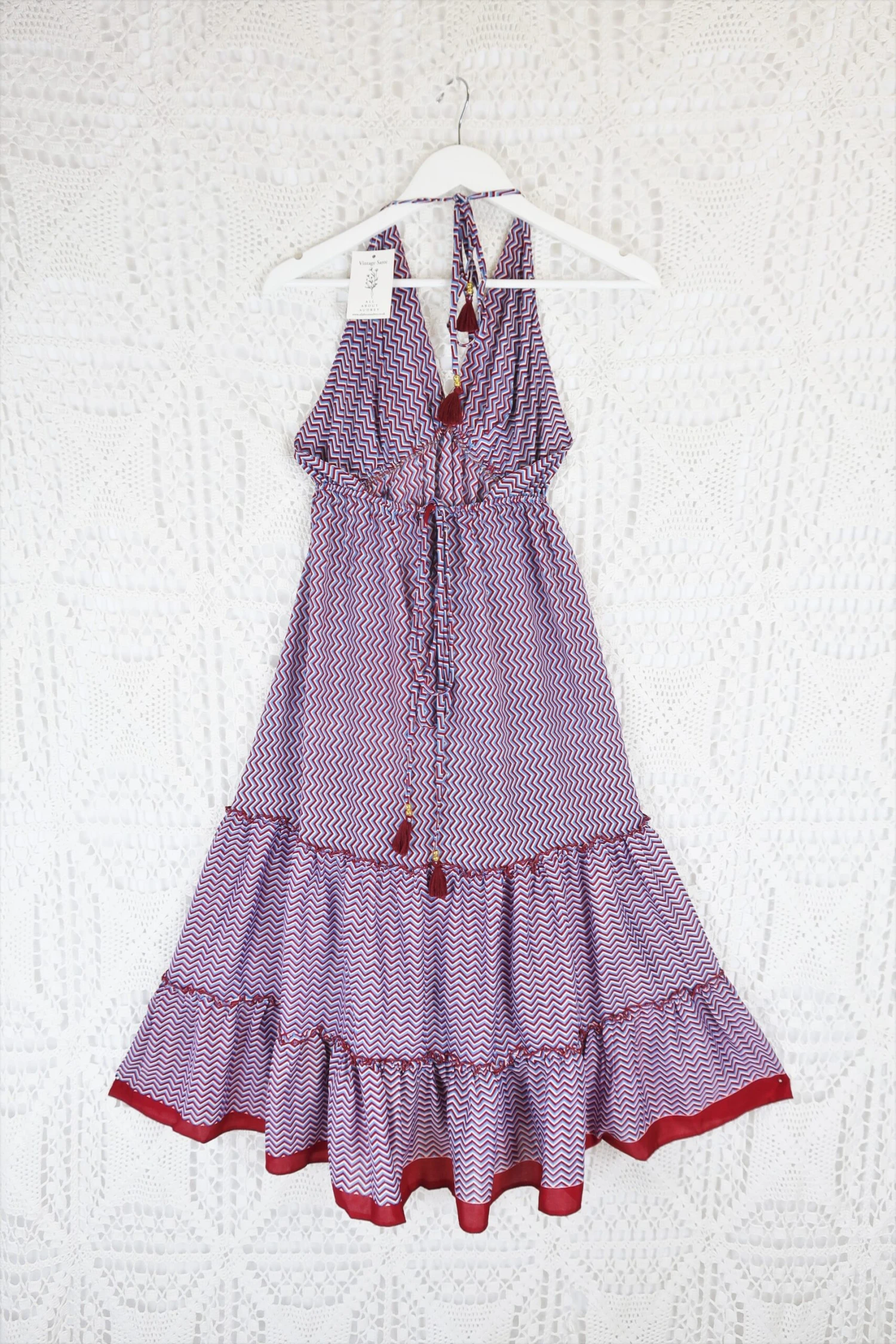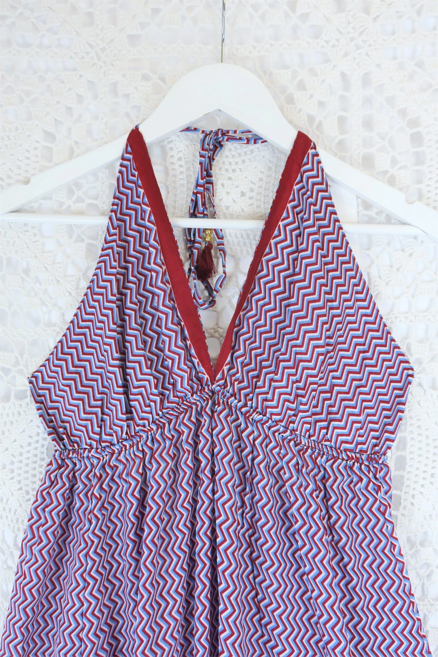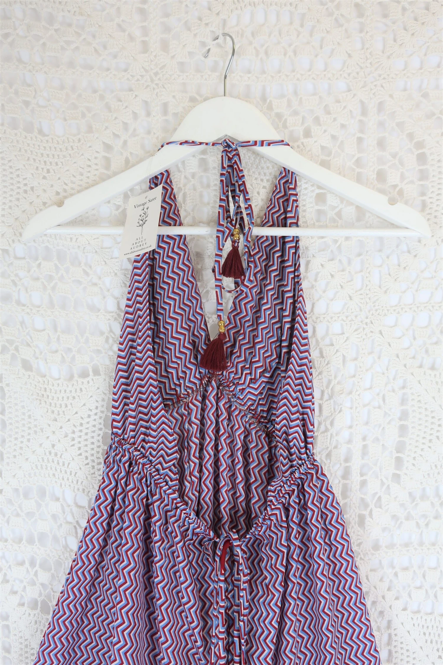 Stunning halter-neck mini dress, re-made from vintage recycled Indian fabrics. Super soft silky material with a gorgeous colour and print. Tassels at the neck and as a drawstring waist to adjust the size.