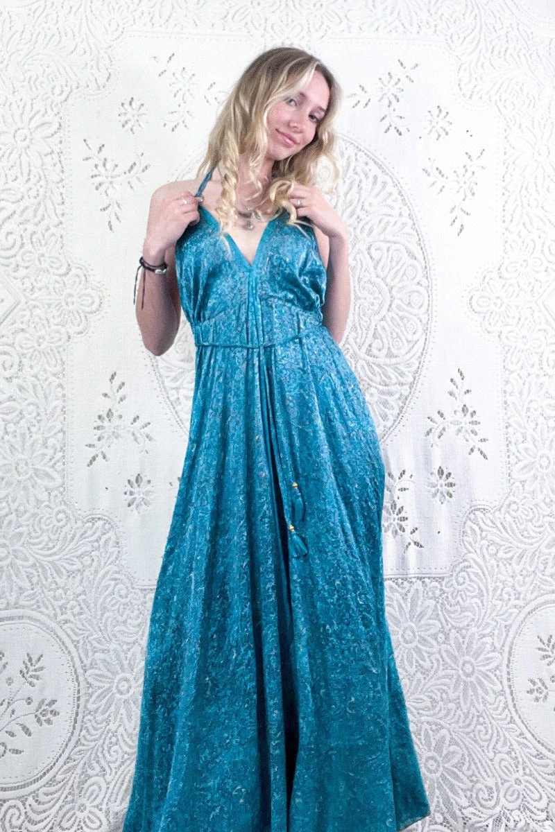Our Eden dress – this elegant style is a dream! With it’s long floaty skirt and a drawstring waist that can be adjusted and cinched in to fit you! Also featuring a classic halter-neck design with eyelet ring details.