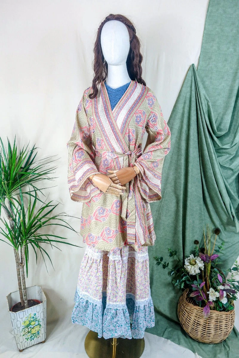 With long retro floaty wide sleeves, a belt and wrap ties inside to adjust to your shape, alternatively use the belt loops with a vintage belt for a more retro look. It’s super flattering to wear as a cute mini dress or easy to style and layer over flares and light knitwear! Also has handy pockets!