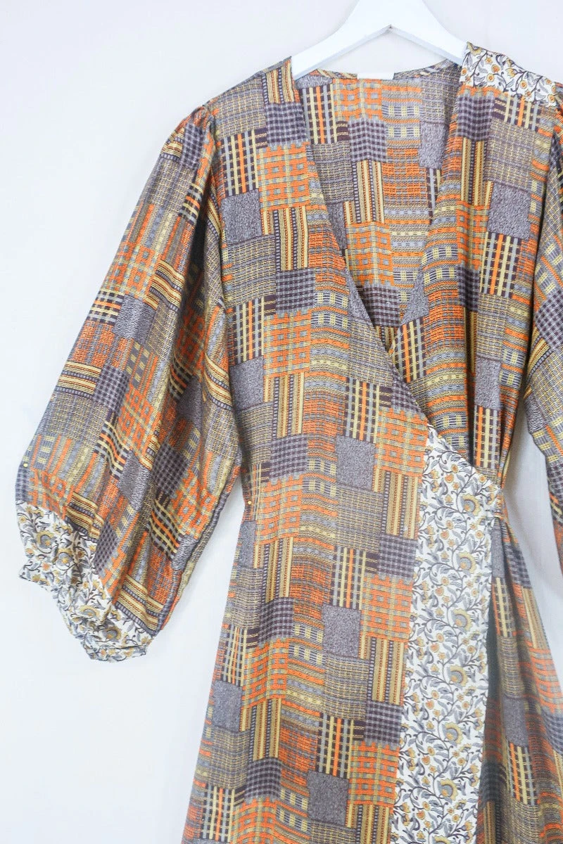 This maxi length wraparound dress can be adjusted to fit larger or smaller as you wish, with the prettiest 70s cuffed balloon sleeve, deep V neckline and a long straight skirt. It also looks wonderful worn open or tied at the front as a lightweight duster jacket.