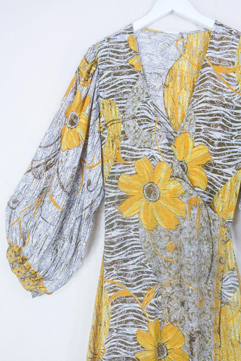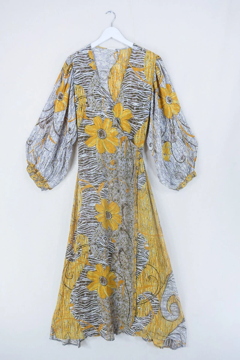 This maxi length wraparound dress can be adjusted to fit larger or smaller as you wish, with the prettiest 70s cuffed balloon sleeve, deep V neckline and a long straight skirt. It also looks wonderful worn open or tied at the front as a lightweight duster jacket.