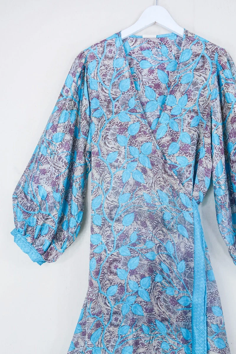 This maxi length wraparound dress can be adjusted to fit larger or smaller as you wish, with the prettiest 70s cuffed balloon sleeve, deep V neckline and a long straight skirt. It also looks wonderful worn open or tied at the front as a lightweight duster jacket.