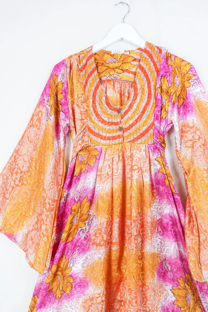 Our flattering Lunar Dress – Features a square neckline, which buttons to waistline, & has flared half sleeves and adjustable wide waist ties, so it can fit your waist perfectly! The skirt is loose and flowing with a frilled drop hemline.