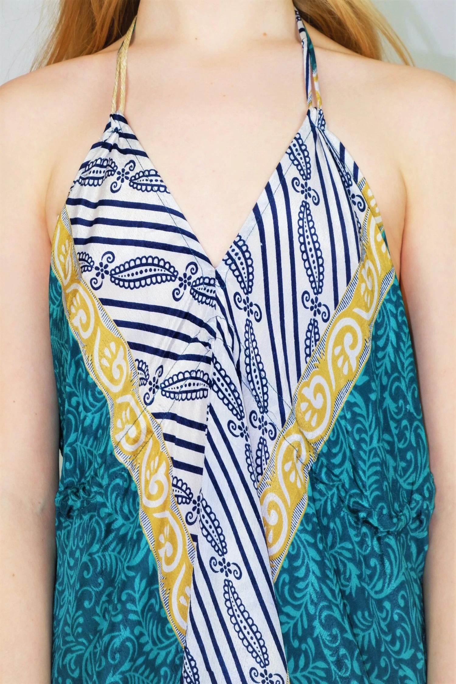Stunning halter-neck maxi dress with a dramatic asymmetrical hem the gives it an amazing & easy to wear shape. Tassles at the neck and a drawstring waist means that this style can be adjusted for multiple sizes.