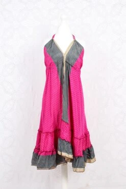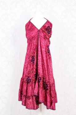 Blossom Mini Halter Dress – Vintage Indian Sari – Moonlight, Inky Blue & Pink Graphic – XL