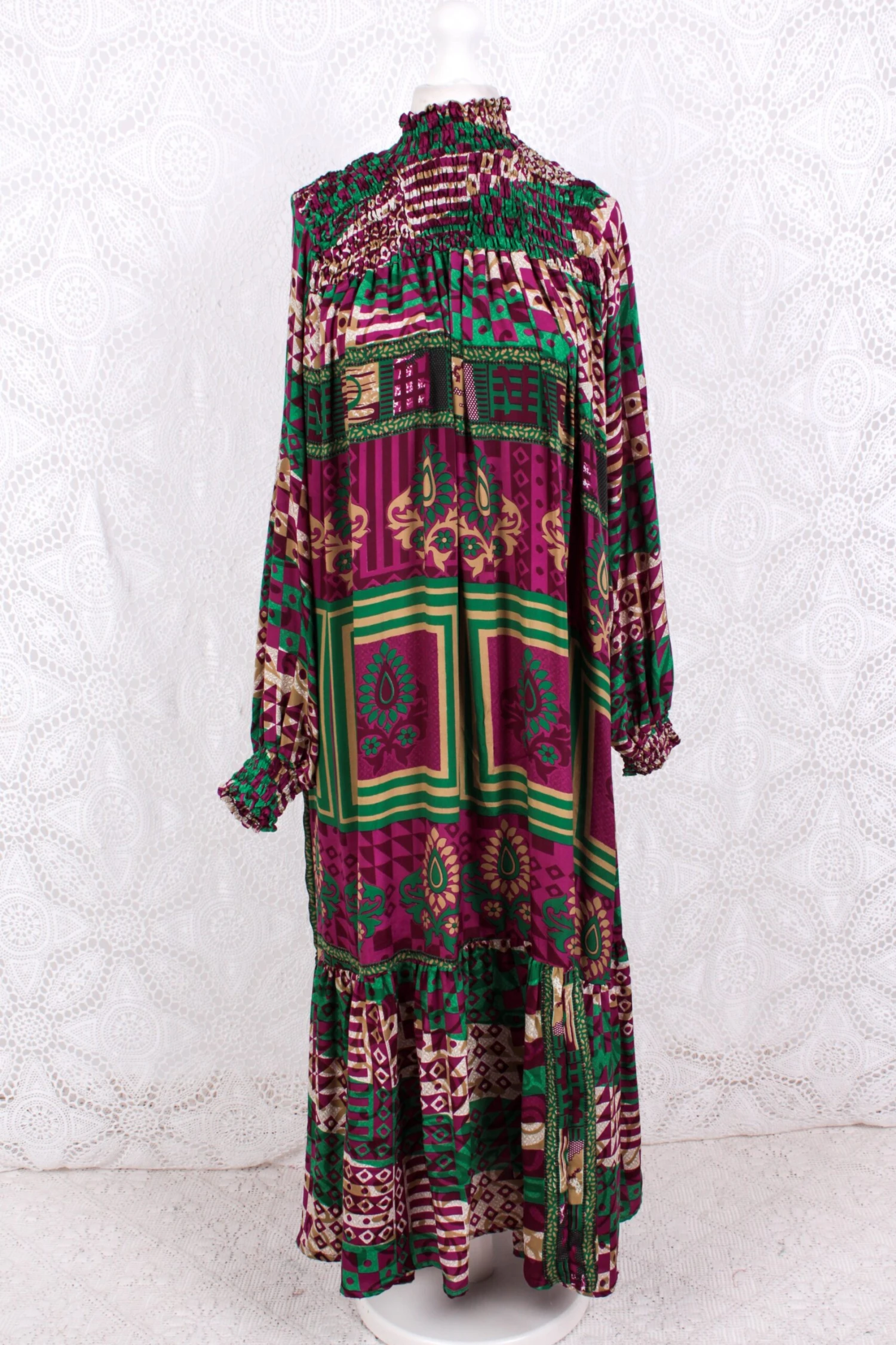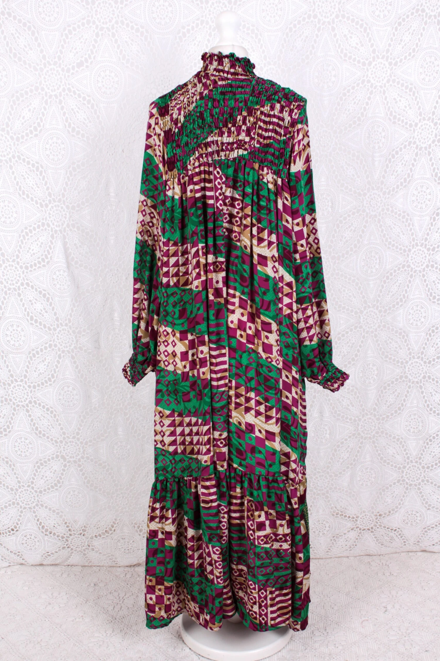 Really high neckline, with ruched bust panel and back, long balloon sleeves that gather at the cuffs. It is a long midi length dress with with a lovely frill hem.