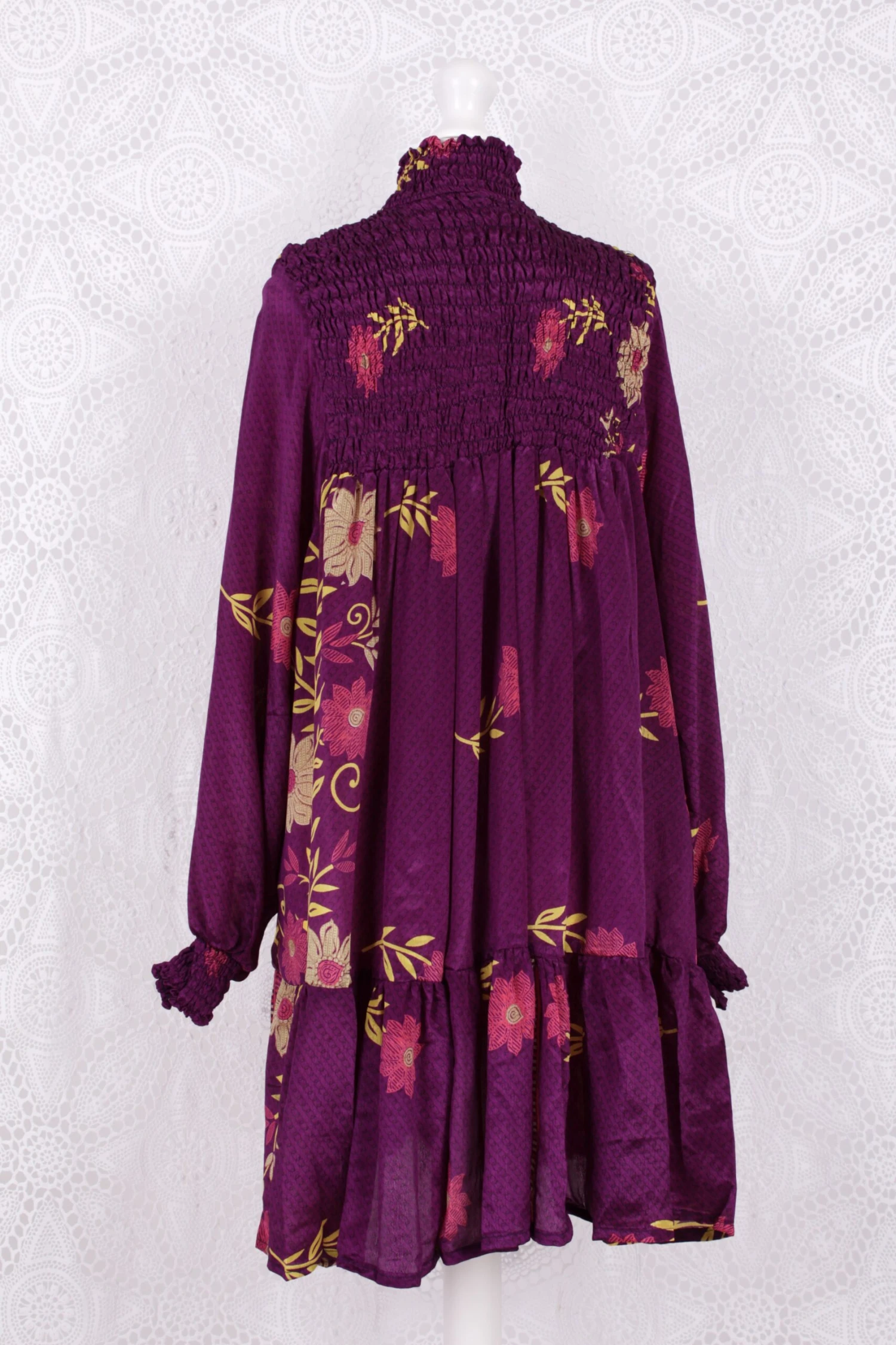 Really high neckline, with ruched bust panel and back, long balloon sleeves that gather at the cuffs. It is a short length dress with with a lovely frill hem.