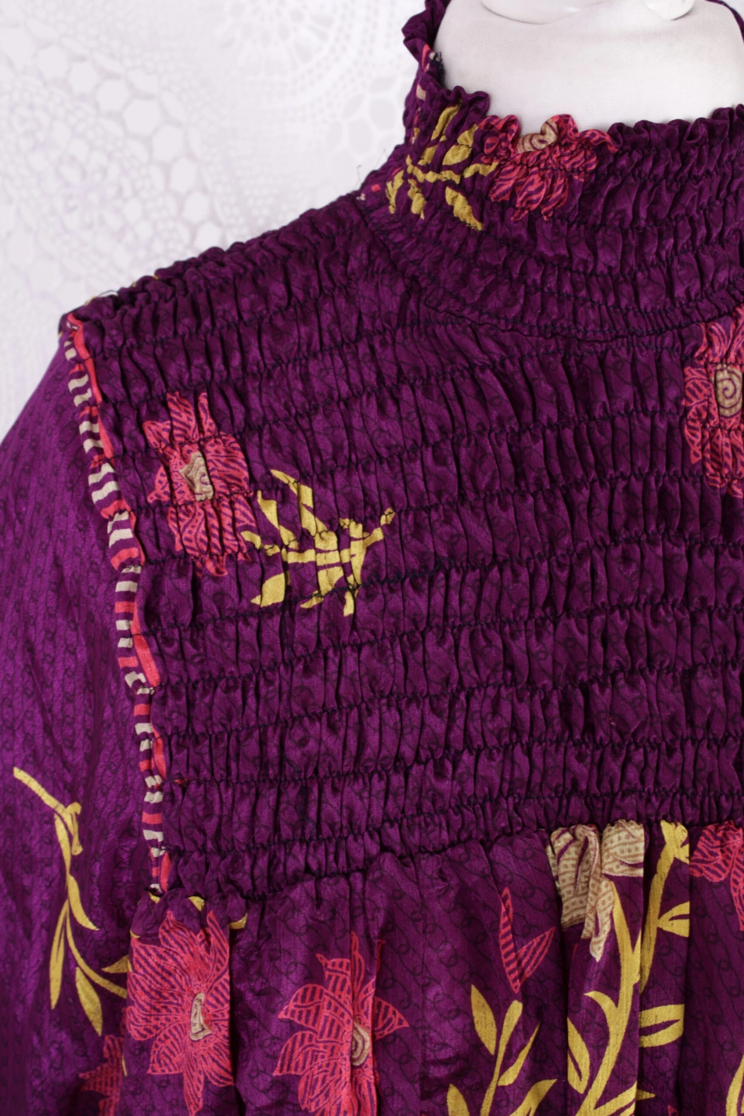 Fabric: Vintage Indian Sari – unknown exact content blend – feels silky and soft. Each One is completely unique and one of a kind.