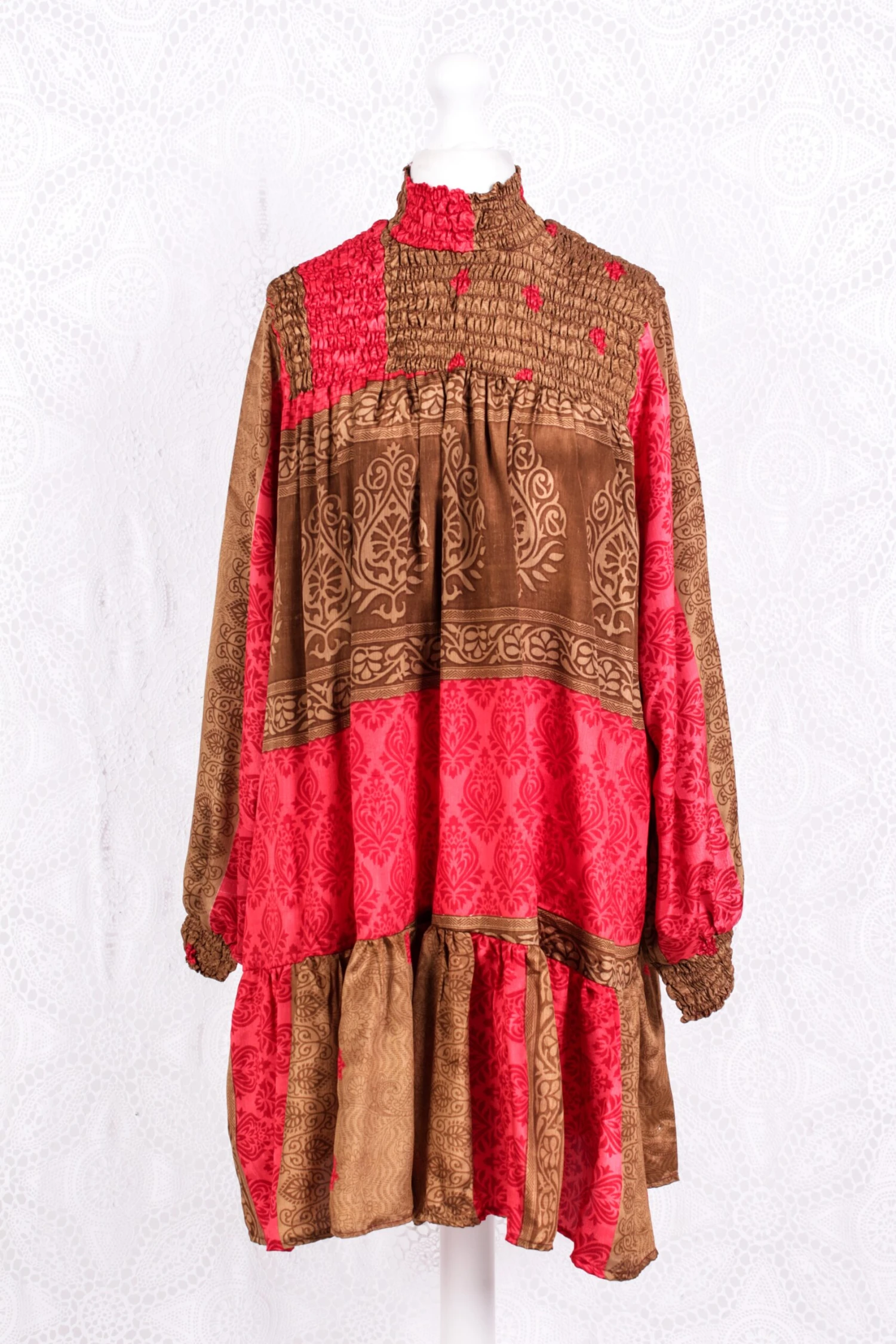 Really high neckline, with ruched bust panel and back, long balloon sleeves that gather at the cuffs. It is a short length dress with with a lovely frill hem.