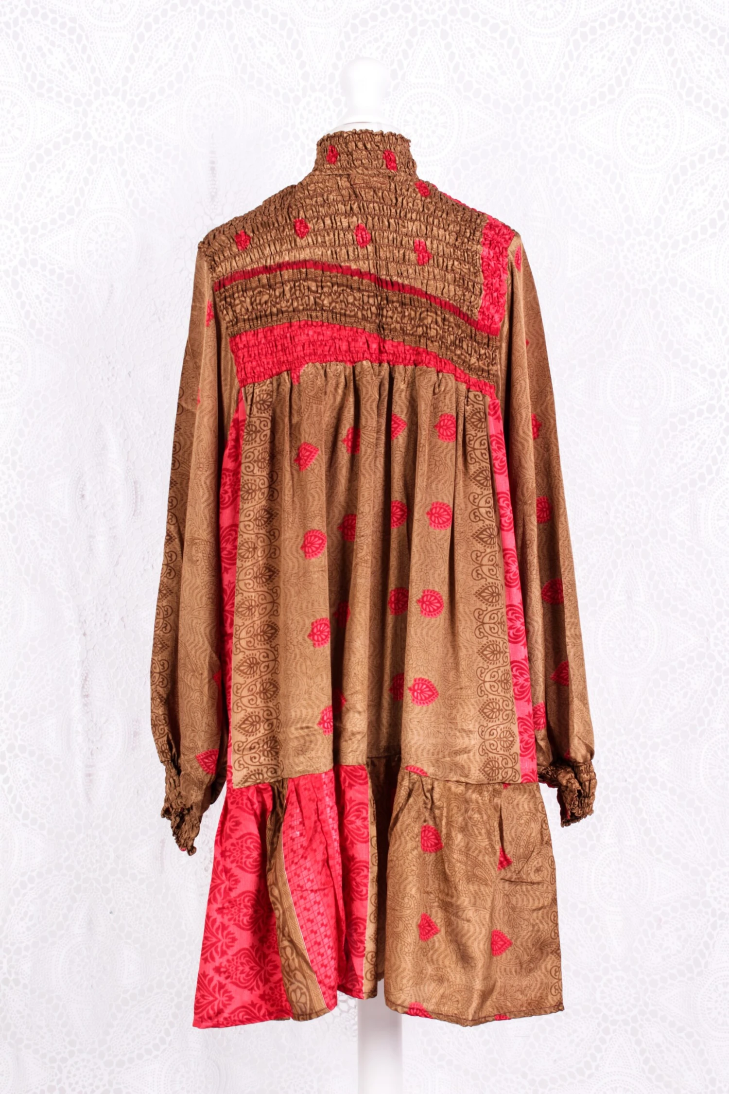 Fabric: Vintage Indian Sari – unknown exact content blend – feels silky and soft. Each One is completely unique and one of a kind.