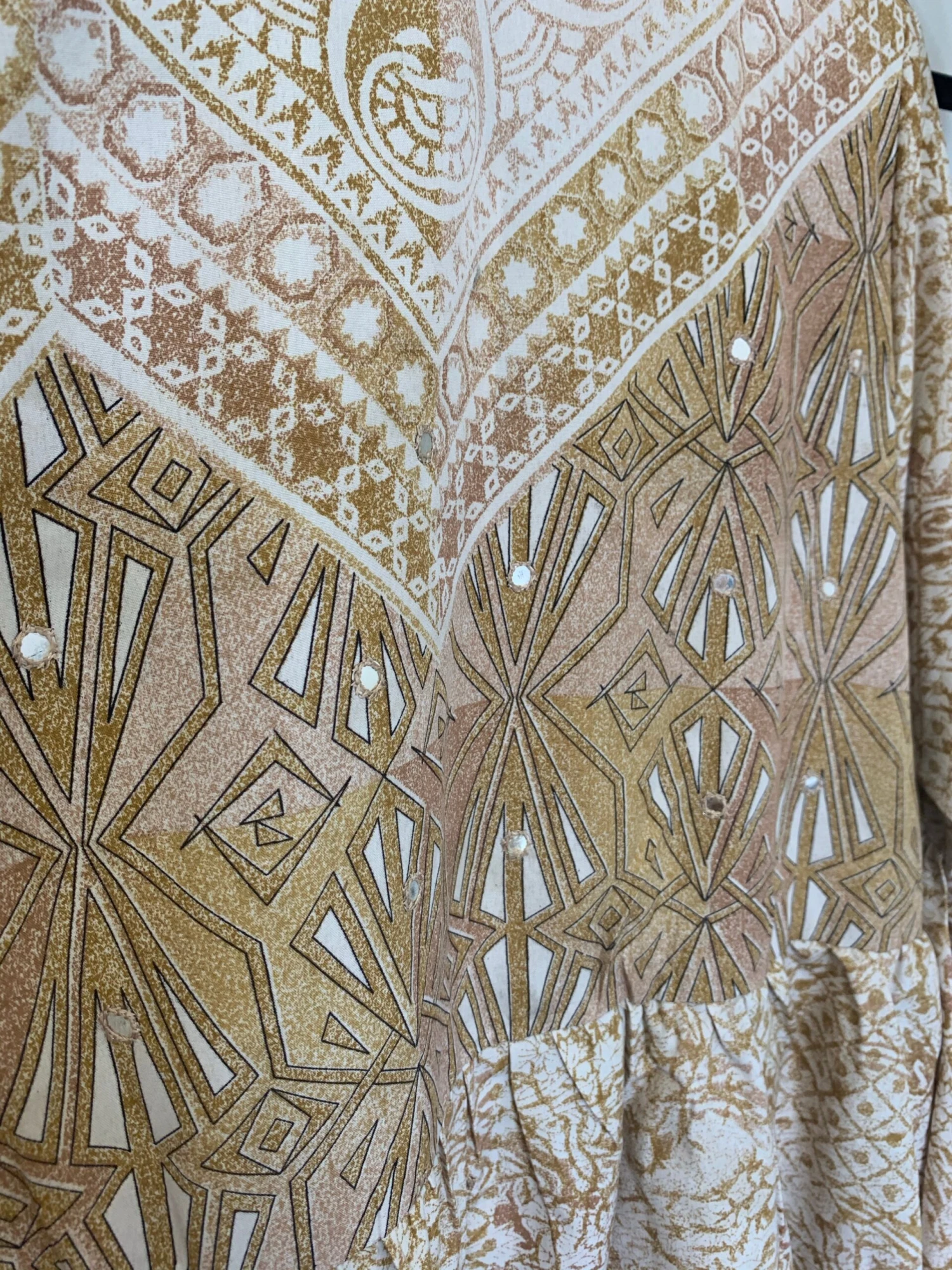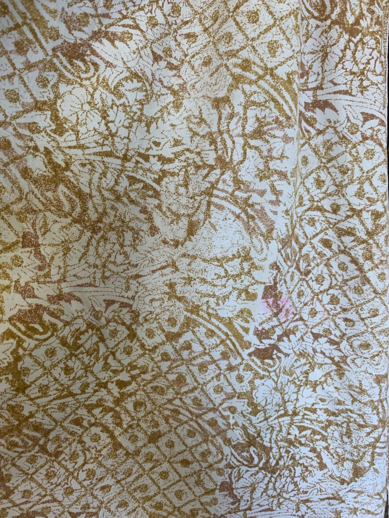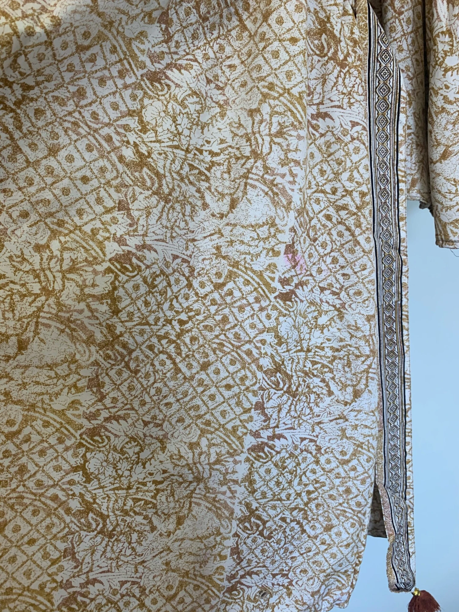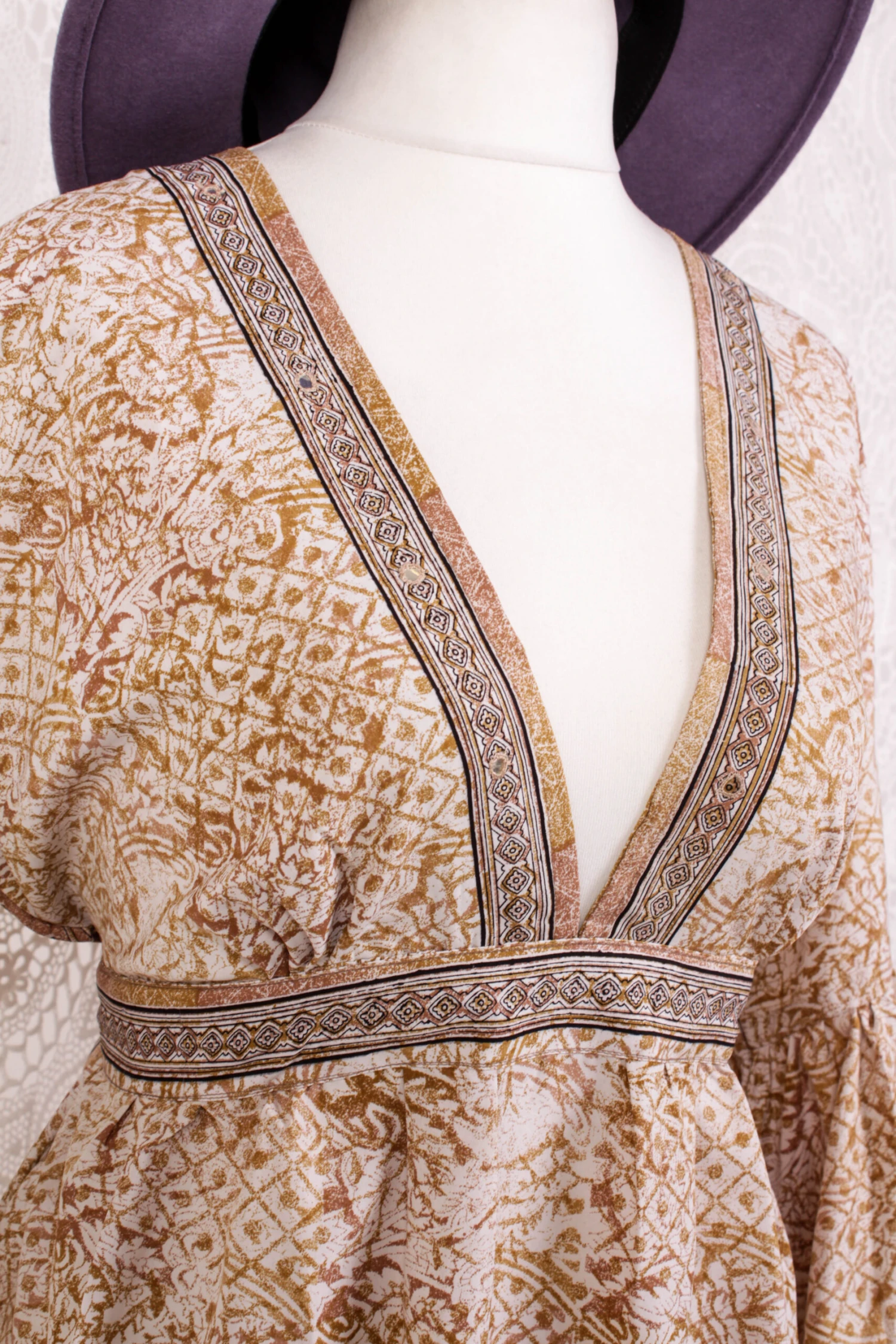Fabric: Vintage Indian silk mix – The Fabric is Vintage Indian Sari and of Unknown Exact Content Blend, feels a silky poly blend. There can be very minor flaws, such as pulled threads or tiny marks, but any large faults or stains will always be mentioned. This one does have a pink stain on the front and a faint grey mark on the back, but this is still a beautiful dress! All pictured.